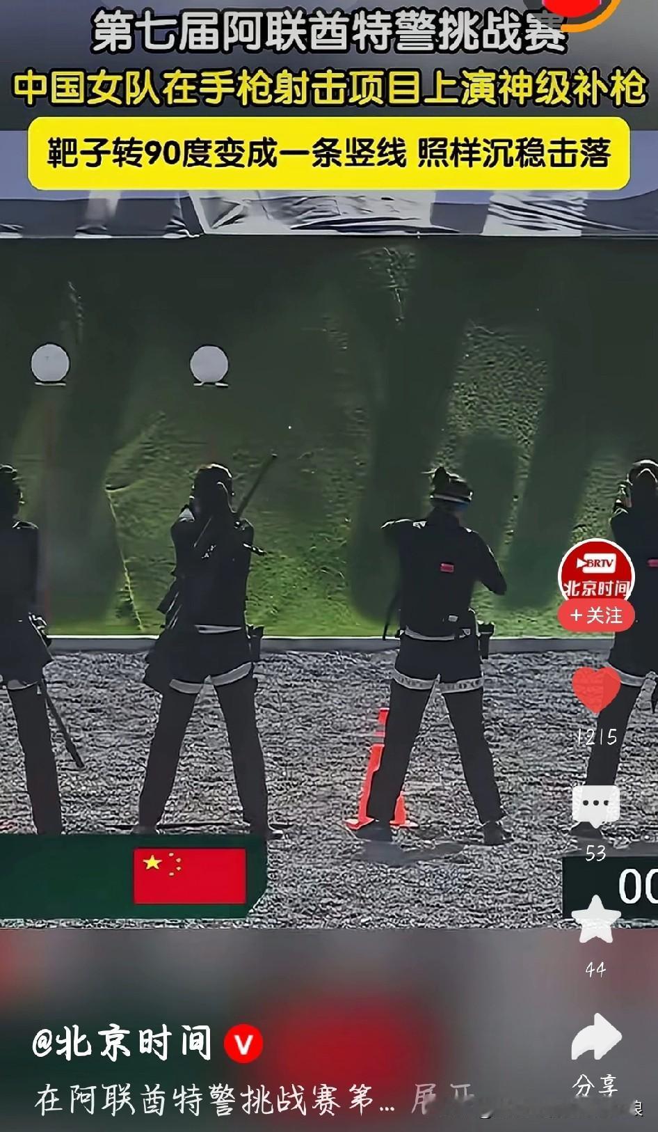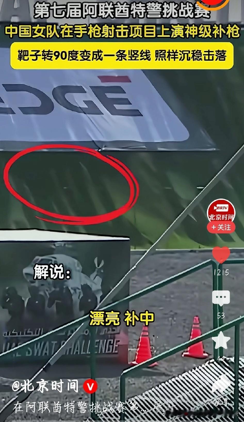 太稳了!中国女特警神级补枪,惊艳全场! 阿联酋特警挑战赛上,中国女特警上演教科书级操作!第一枪命中后,靶子突然旋转90度,只剩一条窄窄的竖线,很难打中。 关键时刻,队员沉着冷静,快速调整、果断补枪,一枪精准命中竖线靶,稳稳击落靶标。没有多余动作,没有丝毫慌乱,心理素质和射击水平拉满。 这就是中国特警的硬实力,平时千锤百炼,赛场一击制胜。又飒又强,太给中国人长脸!为中国女特警点赞! 中国女特警上演神级补枪, 中国女特警神级补枪 中国特警太帅了 阿联酋特警大赛 中国女特警 图片截图于网络