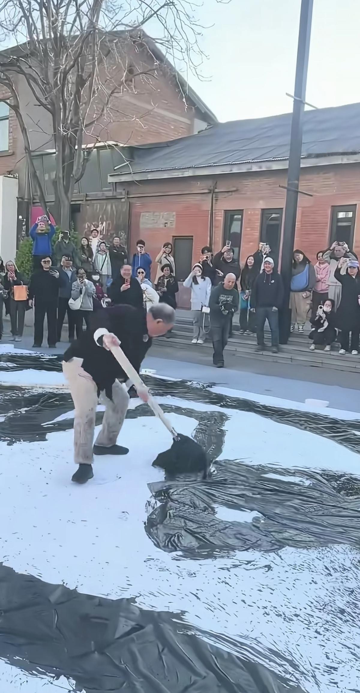 “这是在做什么?”据说这场面99%的人看不懂。我猜到了,但不敢相信。 一位老人,手持一个拖把,沾满了墨水,地上铺了一张大纸,而他就用拖把在上面轮着。 周边有不少人围着观看,有的人还把这场面拍下来。 你能猜到这是在做什么吗? 就算猜到了,你能看懂写的是什么吗? 他正在创作一幅书法作品。 如果我说他是某位书法家,你敢信吗? 不管是谁写的,我是欣赏不来这样的作品到底美在哪里。