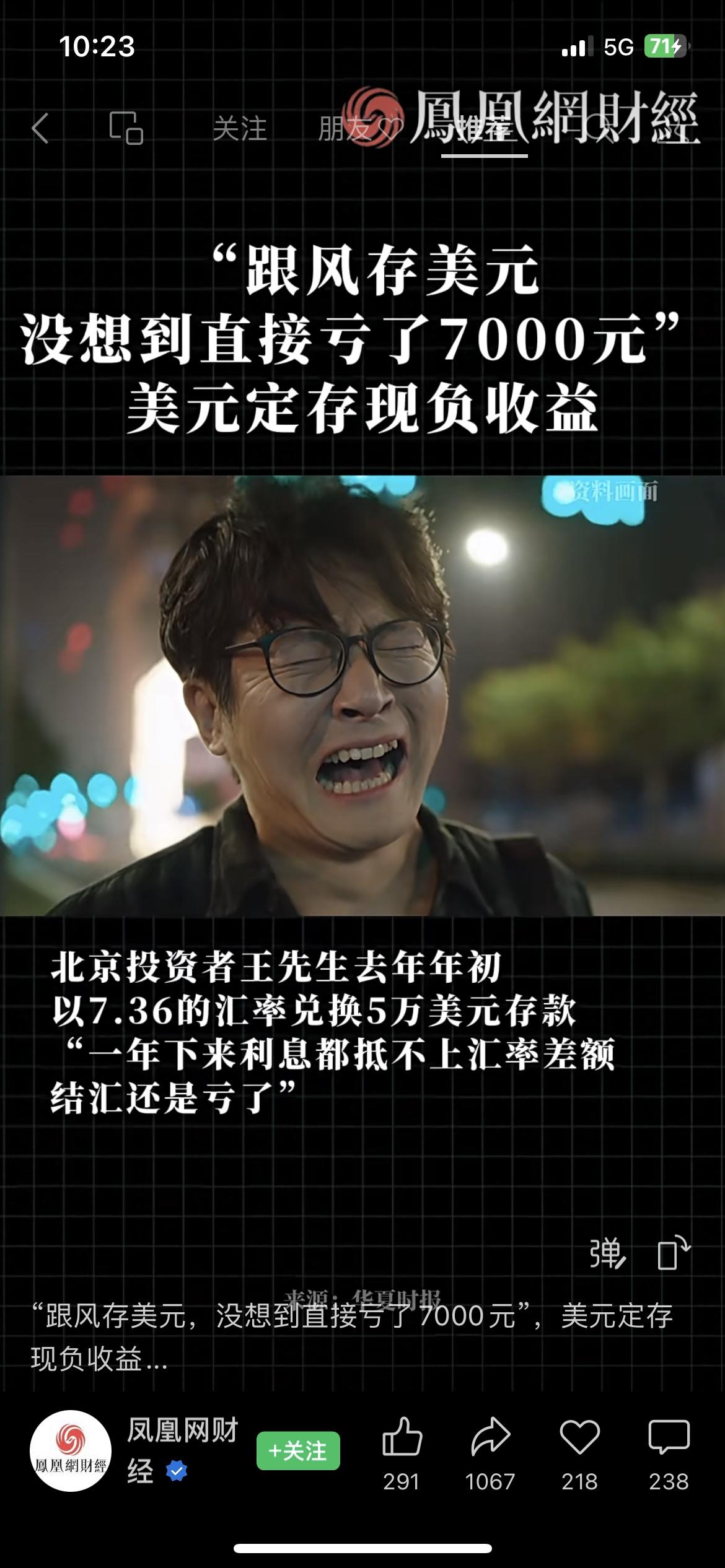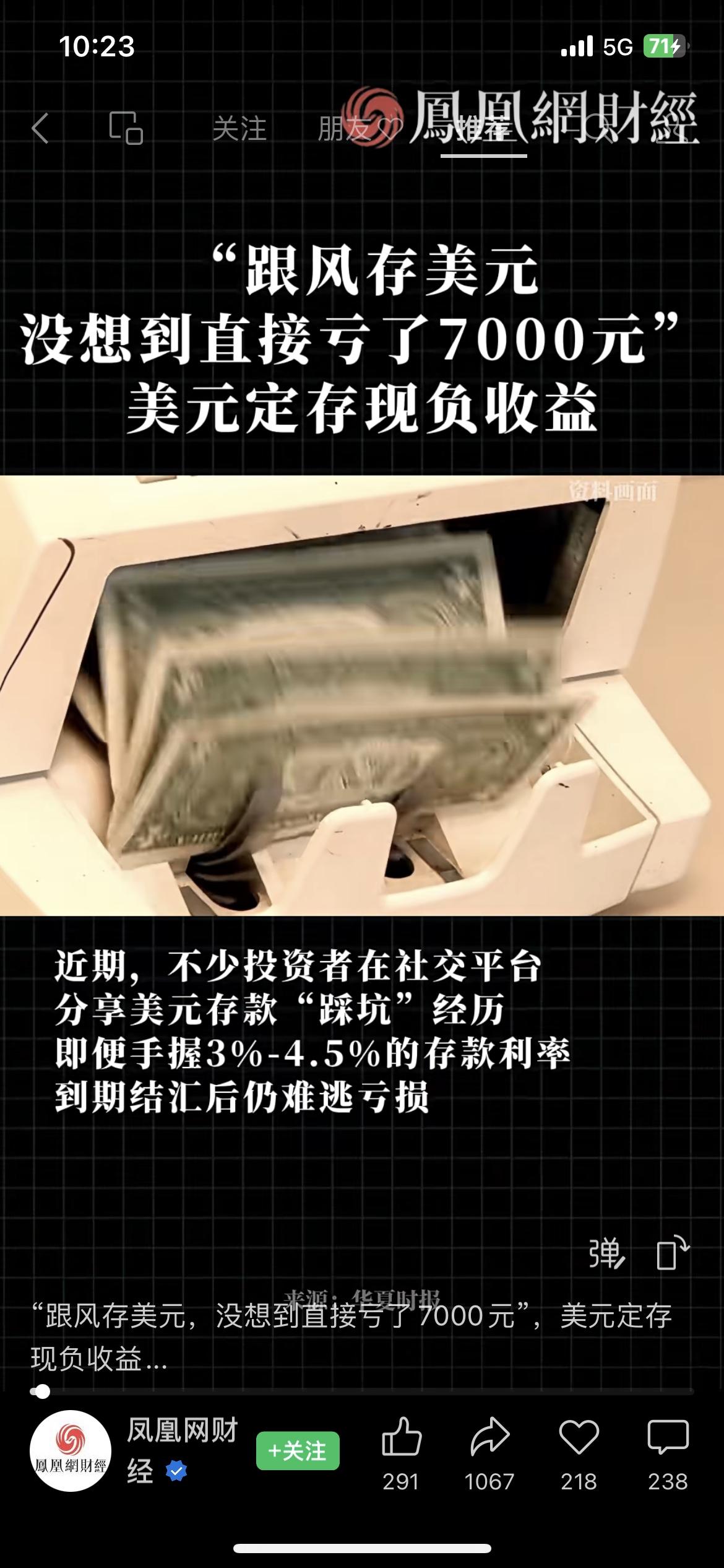 跟风存美元,没想到直接亏了7000元!上海一位投资者2025年初持有一年期美元定存利率4.5%,但因美元兑人民币汇率全年下跌4.94%,最终以人民币计价收益率为-0.71%。这不是个例,是汇率风险的真实写照,普通人记住:高利率≠高收益,汇率波动才是最大的坑。 市场有风险,投资需谨慎。 你会跟风存美元吗? 美元定存负收益 汇率风险 跟风投资