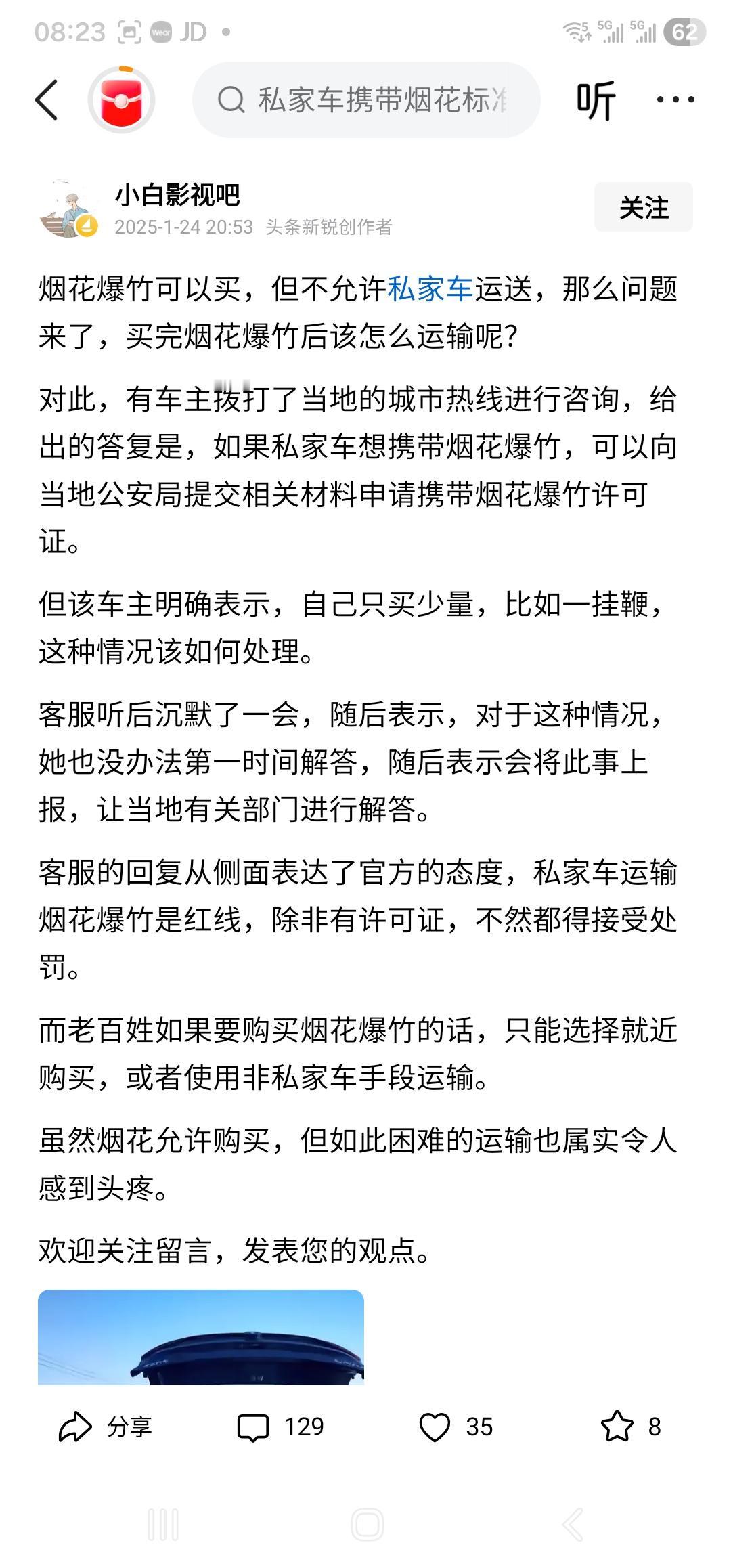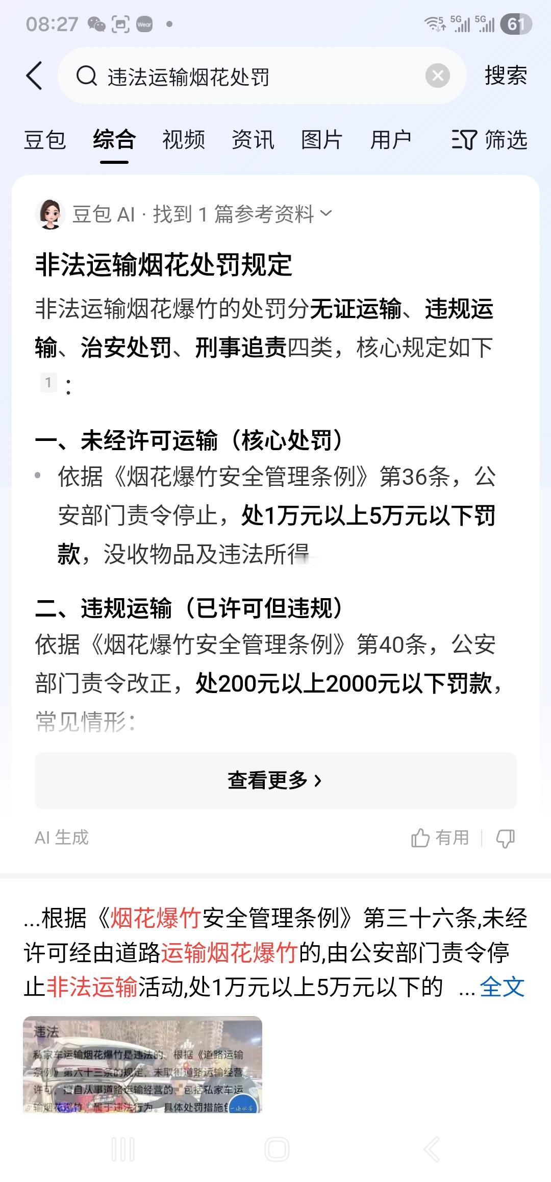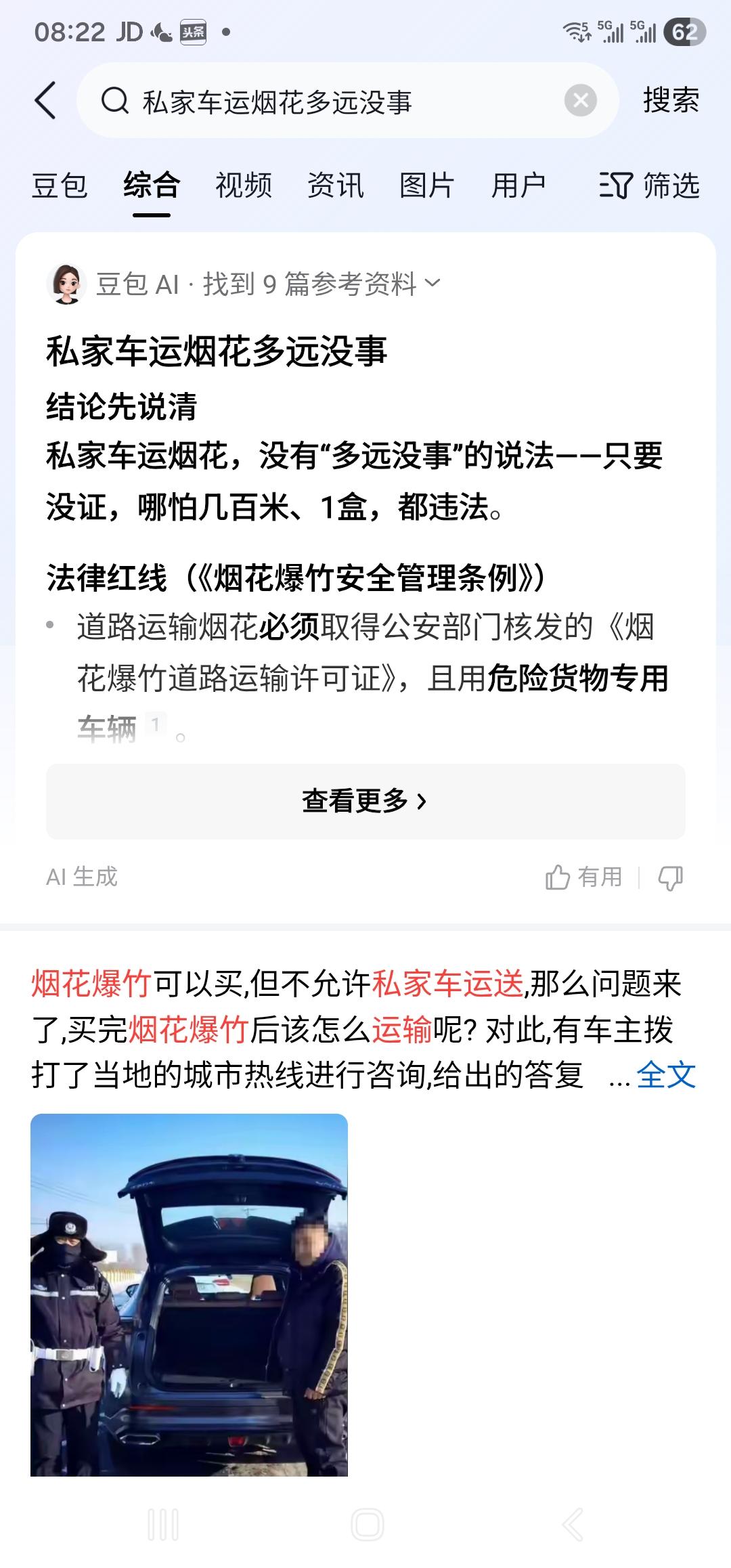 私家车运烟花的问题,我问了问豆包。豆包回答:私家车运烟花,不管多少,不管多远,只要没证,就不行。 那么问题来了,到集上买了一挂鞭炮,怎么拿回家呢? 如果买了一箱烟花,或者两箱烟花呢? 最关键的是,一旦被查到,处罚还挺厉害。