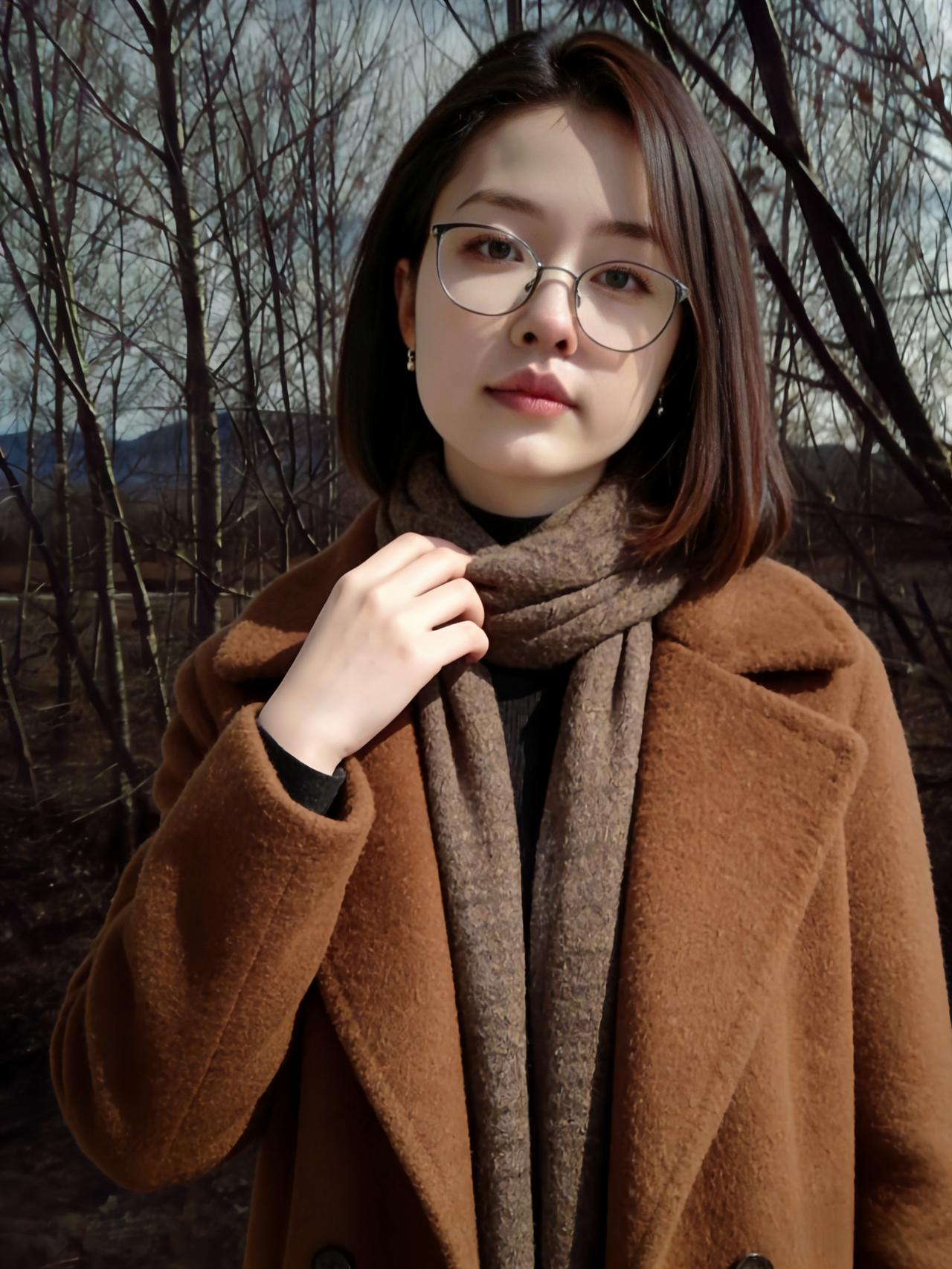 野径凝寒翠,衣裁驼色柔。 巾围寒颈暖,晶框映林幽。 发剪齐眉短,身依古树稠。 独立荒郊里,眸光淡似秋。