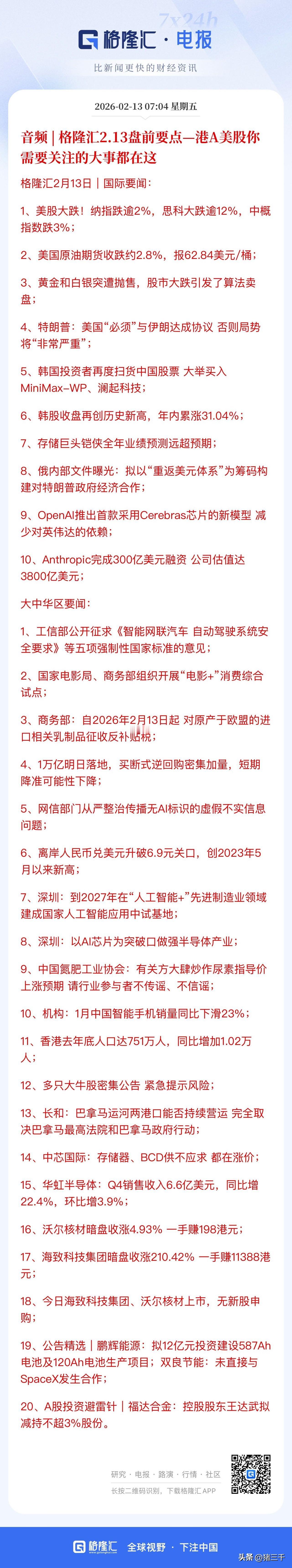 早盘, 春节前最后一个交易日! 外围市场唱了一出“杀鸡儆猴”, 中概股指数大跌3%, Ai要再度赢risk-off论调, 就看A股意志是否坚定了! Seedance在外网更加火, 显然谷歌、open Ai、X-Ai都感受到了压力, 马斯克倒是大大方方转发和点赞了一波SD! A股Ai昨天来了一波全面加速, 智谱、mini Max、优刻得、首都在线等, 短期情绪溢价到顶峰了会大分歧; 隔夜掌阅科技等牛股也发出风险异动提示! 节前最后一个交易日, 看今天消费、白酒、券商能不能动一下, 昨天银行压盘都要冒烟了, 最后创业板在科技带领下还是冲破了桎梏! 三千昨天杉杉股份二进宫效果不理想, 昆仑万维短线出击看今天能不能全身而退! …