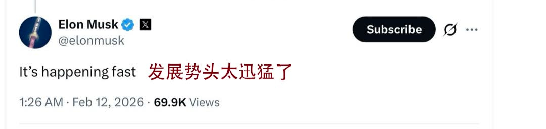 字节跳动视频模型Seedance 2.0同样在海外爆火。马斯克在其社交平台X转发评论Seedance 2.0相关推文,并表示模型发展速度太快(It's happening fast)。