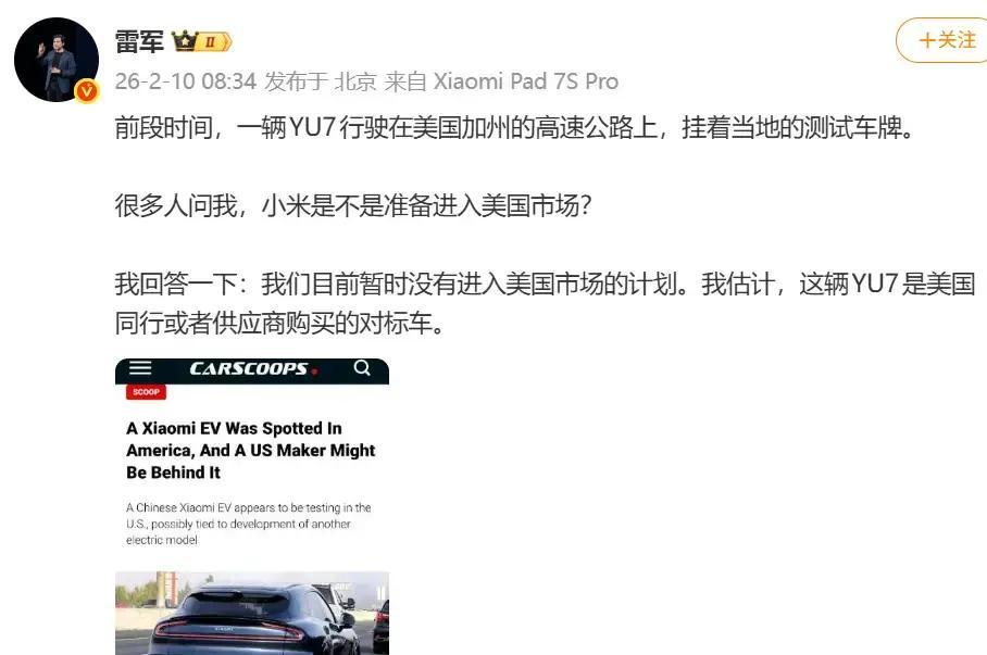 雷军直接在微博上澄清:小米目前暂时没有进入美国市场的计划。他觉得这车多半是美国同行或者供应商买去当对标车的,用来研究和对比自家产品。 这事儿其实也挺正常,中国新能源车现在全球影响力大,国外车企买回去拆解学习很常见。反过来也说明小米YU7的产品力已经够硬,能吸引别人花钱买来研究。 小米汽车现在重点还是稳扎稳打国内市场。2025年全年交付超41万辆,2026年目标定在55万辆,增长势头很猛。主力车型YU7上市半年就累计交付破15万辆,比同期SU7多出一倍,25万级定位打得准,配置均衡,成了销量扛把子。 SU7目前在新老切换阶段,主要靠YU7顶着交付,新一代SU7四月就要上市,配置升级,起售22.99万起,还全系带激光雷达和长续航,值得期待。 小米出海计划其实早有眉目,优先欧洲、东南亚、中东,预计2027年才正式启动。国内订单还排着队,先把自家地盘守好、做好口碑,再谈海外扩张才靠谱。 这波回应也让大家看清,小米造车节奏稳,不盲目冲美国那种高壁垒市场,而是先把实力练扎实。中国新能源车出海靠硬实力,小米这步走得清醒