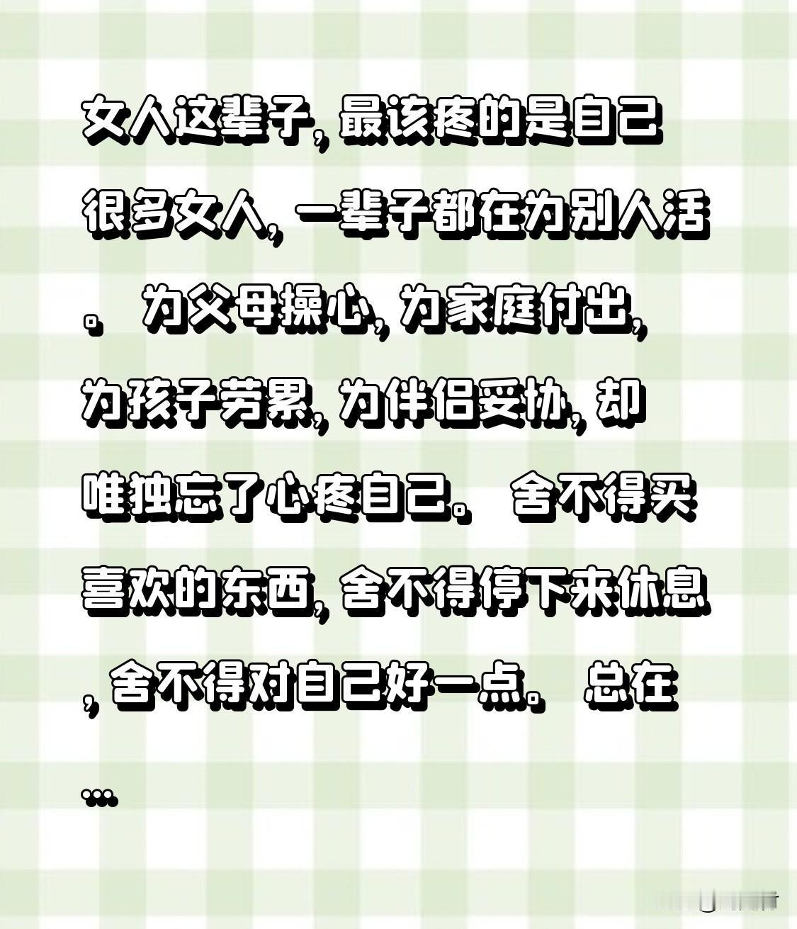 女人这辈子,最该疼惜的是自己 很多女人一生都在为他人而活。 为父母忧心,为家庭付出,为孩子操劳,为伴侣让步,却唯独忘了心疼自己。 舍不得买心仪之物,舍不得停下歇息,舍不得对自己好些。 总是委屈自己,总是迁就他人,总是把希望寄托在别人身上。 可到最后你会发觉: 靠人,人会离去;靠水,水会流走,唯有依靠自己最踏实。 女人这一生,容颜会老去,青春会消逝,唯有自身的能力与底气,永远不会离你而去。 好好爱自己,好好照顾自己,好好提升自己。 吃想吃的饭,见想见的人,做想做的事,过想过的生活。 不讨好他人,不将就生活,不委屈自己。 你若盛开,蝴蝶自来;你若自爱,人人敬重。 女人,先疼自己,再爱别人。 女性成长 女人该有的样子 情感