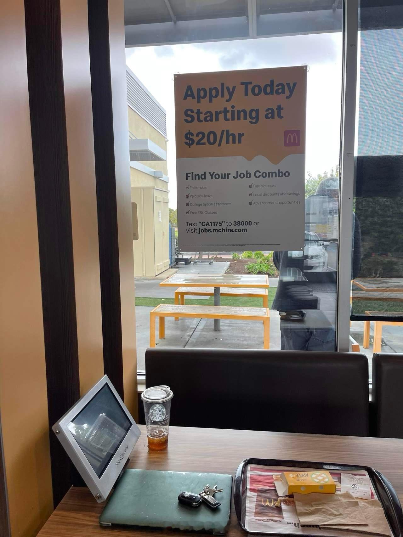 美国洛杉矶麦当劳🍔服务员20美元时薪起,包吃不包住。由于每周最多只能干40个小时,一个月只有3500美元左右。在洛杉矶3500美元只够一个人吃饭养车交房租。所以有老婆有孩子的穷人会再找一份兼职,每周干60个小时,再加上政府给的EBT粮食购物卡(900美元左右每月,各州金额不同),这样才能有比较体面生活。