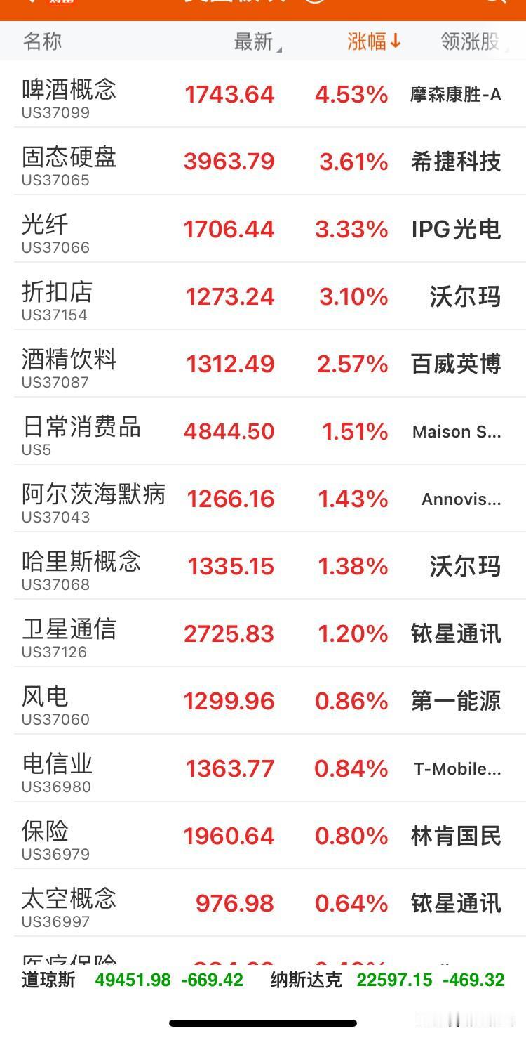 美市 三大指数全线收跌:道指-1.34%、纳指-2.03%、标普500-1.57%,中概金龙指数重挫-3.00%。 板块分化明显,消费类逆势走强,啤酒概念领涨+4.53%;存储、光纤跟涨,科技成长类遭重挫,网络安全领跌-10.99%,资金从高估值科技股流向防御性消费板块。