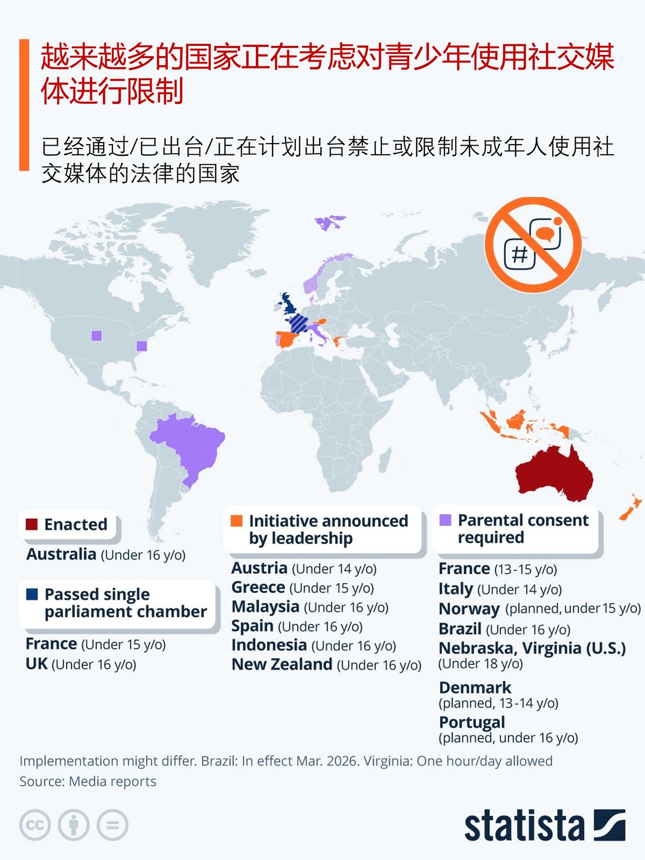 越来越多的国家正在考虑禁止青少年使用社交媒体,你有什么看法? 在澳大利亚针对 16 岁以下青少年实施的首个此类社交媒体禁令于 12 月生效后,欧洲及其他地区的更多国家正在采取措施实施各自的限制措施。据 Statista 的研究显示,法国和英国已经走得最远,截至 2 月初,两国的两院都已通过相关法律。而英国还计划对 16 岁以下儿童实施社交媒体禁令,但法国的拟议法律仅针对 15 岁以下人群。 又有六个国家的领导人宣布了旨在禁止青少年使用社交媒体的举措。尽管印度尼西亚、马来西亚、新西兰和西班牙都计划出台更严格的规定,只允许 16 岁以上的人员使用社交媒体,但希腊计划将 15 岁以下的青少年排除在外,而奥地利则打算将 14 岁以下的青少年排除在外,禁止他们使用社交媒体。 社交媒体,包括个性化算法以及可以无休止地滚动浏览的功能,因其对心理健康的影响而受到关注,尤其是在年轻人中。社交媒体成瘾现象可能影响任何年龄段的人群,但被认为对正处于社会行为、身体形象和时间管理技能发展阶段的青少年危害尤其大。 据报道,葡萄牙和丹麦的领导层又宣布了两项拟议中的禁令。但他们愿意为家长同意留一个“后门”,这使得他们的做法与一些国家(如法国、意大利以及最近的巴西)所采取的做法有所不同。在这些国家,如果家长同意,年龄符合要求的孩子就可以访问社交媒体网站。 虽然像澳大利亚那样的全面禁令通常会通过严格的官方年龄验证机制来实施,但家长同意的监管方式可以通过关联家长账户等方式来实现。与此同时,Instagram 已在欧洲、美国、澳大利亚和加拿大推出了这一功能,13 至 15 岁的青少年只有在获得家长账户同意的情况下才能禁用一种特殊的限制账户模式。与其他平台一样,Instagram 接受 13 岁及以上的用户注册,但目前这一限制并非与验证机制挂钩。自 2018 年以来,在欧盟,社交媒体网站在针对未成年人使用个性化广告方面受到了更严格的限制。 如果中国采取措施禁止青少年使用社交媒体,你支持吗?