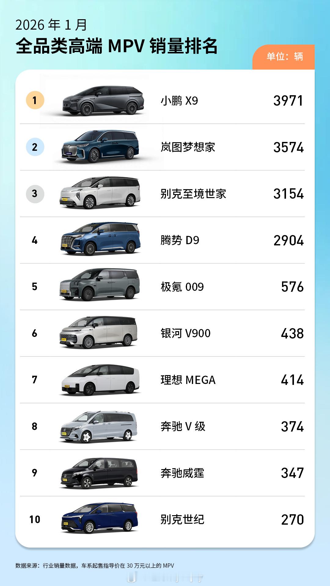 小鹏X9成为了1月份30万以上MPV全品类的销量冠军,