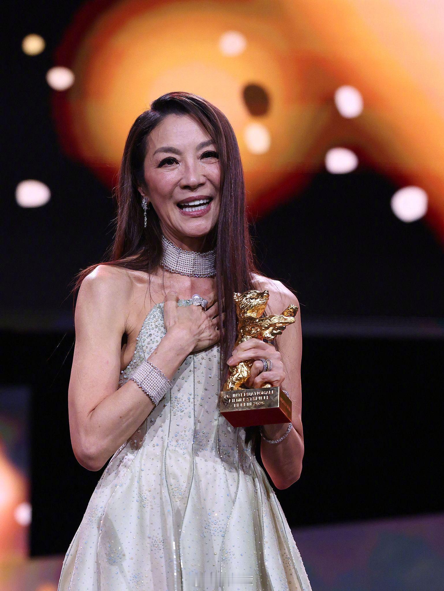 杨紫琼出席柏林电影节领取终身成就金熊奖,著名导演肖恩·贝克为其颁奖。