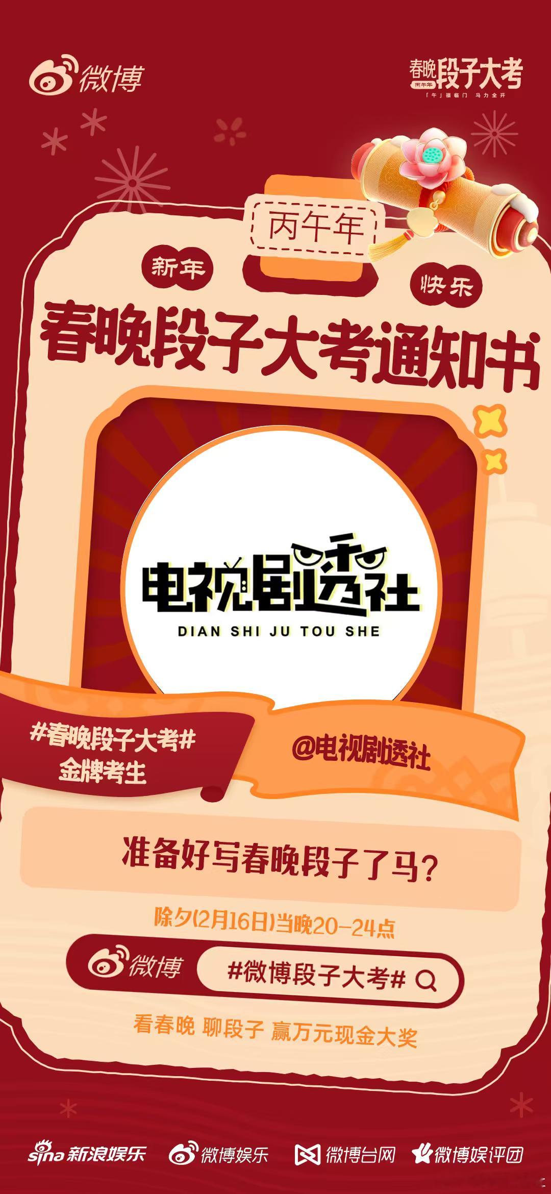 一年一度的春晚段子大考 来啦!段子手前来报道!我们一起看春晚写段子,除夕晚上20点正式开考,我们不见不散!