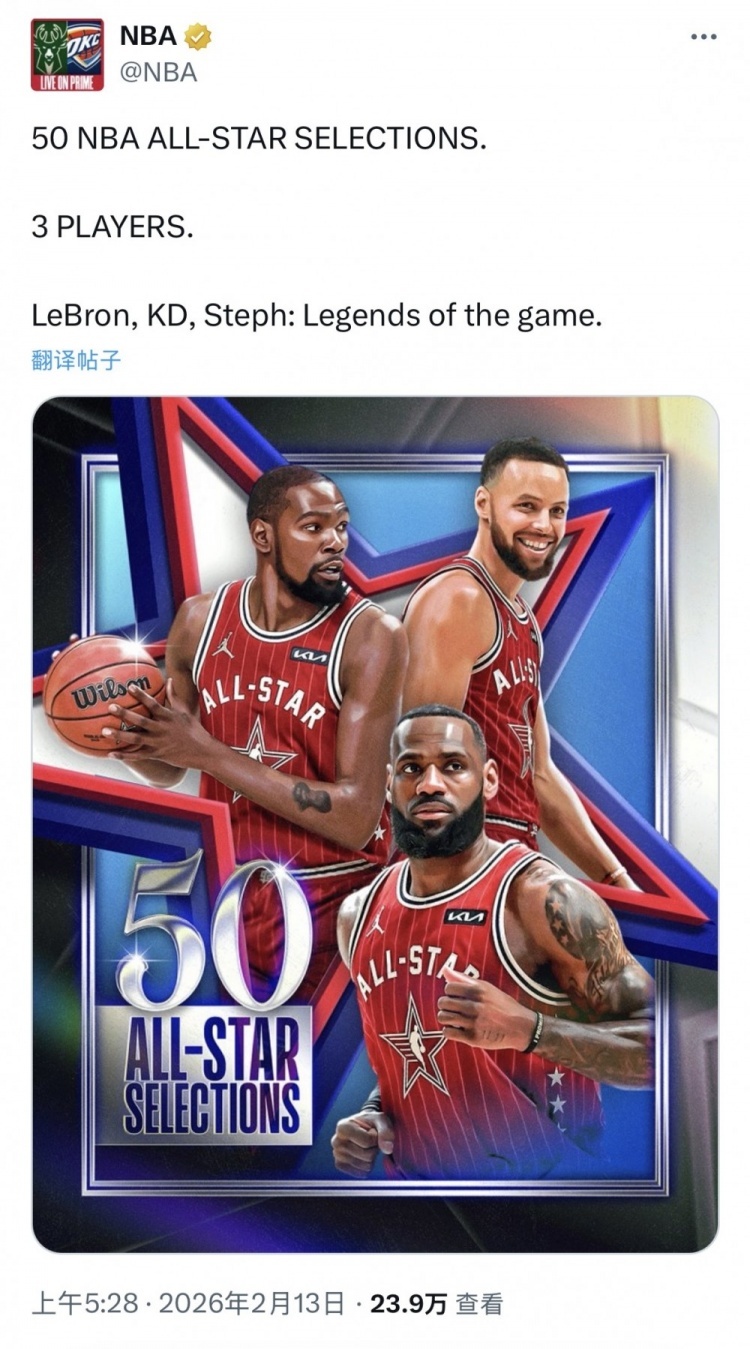 NBA写道:“50次入选NBA全明星阵容。3位球员。勒布朗、KD、斯蒂芬:这项运动的传奇。”