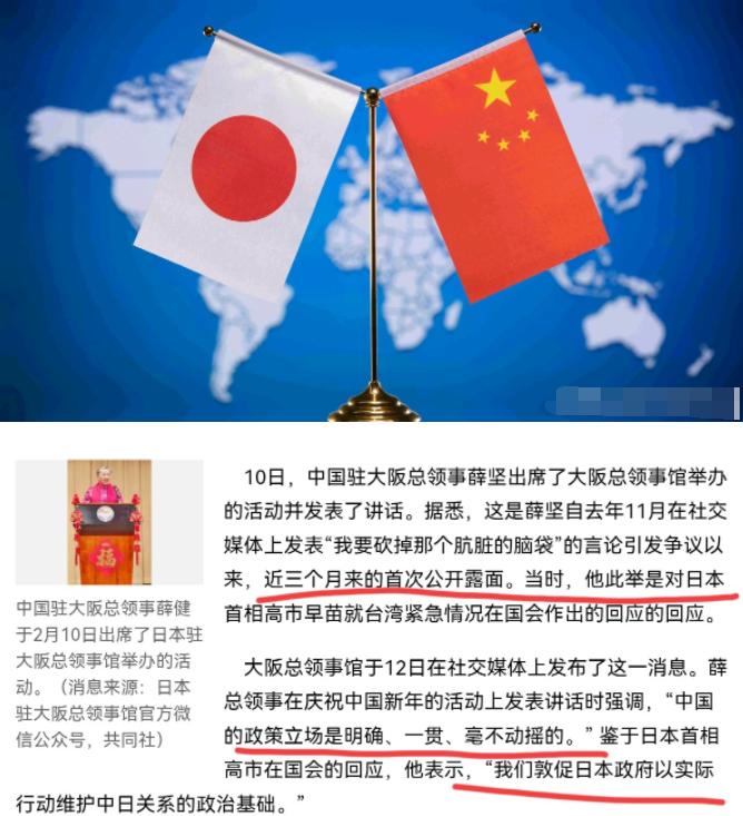 日本媒体注意到了!薛剑大使在对高市早苗言论发出“砍掉那个肮脏的脑袋”后,首次参加公开活动!2月12日,日媒报道称,10日,中国驻大阪总领事薛剑出席了大阪总领事馆举办的活动并发表了讲话。日媒表示据悉,这是薛剑大使自去年11月在社交媒体上发表“砍掉那个肮脏的脑袋”的言论以来,近三个月来的首次公开露面。 先纠正一个小细节,薛剑先生的身份是中国驻大阪总领事,并非大使,日媒偶尔会有称呼偏差,咱们得拎清楚。 日媒这事炒得挺凶,各大主流媒体几乎同步跟进了这条消息,关注度远超平时的领事活动。大家可能会疑惑,不就是一次普通的领事馆公开活动,为啥日媒要揪着不放?答案很简单,全是因为去年11月薛剑总领事那番话。 薛剑总领事当初会说那句话,绝非一时冲动。去年11月,日本首相高市早苗在国会大放厥词,公然扯出“台湾有事就是日本有事”的谬论,甚至暗示要动用武力干涉台海局势。 高市早苗的这番话,可不是简单的口误。它直接违背了《开罗宣言》《波茨坦公告》的明确规定,也撕毁了日本政府在中日联合声明里的承诺,本质就是在干涉中国内政,还透着一股军国主义复活的危险苗头。 薛剑总领事作为中国驻大阪总领事,身处中日交流的前沿,自然要第一时间亮明中方立场。他在社交媒体用日语发帖,大意是如果有人胆敢伸来肮脏的脑袋,那就只能毫不犹豫地砍掉。 这番话一出,日本右翼瞬间炸了锅。大阪地方议会里,还有人跳出来叫嚣要驱逐薛剑总领事,故意曲解这番话是“要行刺高市早苗”。 其实明眼人都能看明白,薛剑总领事的话,从来不是针对高市早苗个人,而是在警告日本右翼势力,警告那些妄图复活军国主义、干涉中国内政的人。 当年日本军国主义侵华,用砍头的方式屠戮中国百姓,中国军民拿起大刀反抗,《大刀向鬼子们的头上砍去》这首歌,就是中华民族不屈不挠的见证。薛剑总领事的表述,本质是在铭记历史,警告日方别再重蹈覆辙。 后来薛剑总领事撤回了那条帖子,改用更规范的外交辞令表达不满。这不是妥协,更不是示弱,而是外交官的灵活处事——既守住中方立场,也给双边交流留有余地。 近三个月来,薛剑总领事没再公开露面,日本媒体就一直紧盯不放,不停猜测中方的态度会不会软化,会不会因为日方的抗议改变立场。 所以这次2月10日的公开活动,才会被日媒当成重点新闻来报。他们全程关注薛剑总领事的讲话,就想从里面找出“立场松动”的蛛丝马迹。 遗憾的是,日媒注定要失望。薛剑总领事在活动上的讲话,清晰传递出中方的一贯立场,既提到了中日民间交流的重要性,也没回避双方的分歧。 他明确表示,中日两千年交流积淀深厚,本该好好珍惜,但这一切的前提,是日方必须尊重中方的核心利益,恪守双方达成的各项共识。 可能有人会问,为啥薛剑总领事要选在这个时间点公开露面?其实背后的信号很明确:中方的立场从来不会因为日方的叫嚣而改变,也不会因为暂时的低调而动摇。 近三个月来,中方一直在用不同方式向日本施压。中国外交部多次召见日本驻华大使,批驳高市早苗的错误言论;官媒也接连发声,揭露日本右翼的危险图谋。 就连日本国内,也有不少人反对高市早苗的做法。冲绳的民众就公开表态,高市的言论太不负责任,会把日本拖入战争,甚至有日本学者直言,高市的话是在破坏东亚和平稳定。 薛剑总领事这次公开露面,就是要告诉日方:中方尊重中日友好,但绝不会容忍任何侵犯中国主权、干涉中国内政的行为;警告日本右翼,别再抱着军国主义的幻想不放,否则必然会遭到坚决反击。 日媒的过度关注,恰恰暴露了他们的焦虑。他们既担心中方的反制力度加大,影响日中经贸合作,又害怕日本右翼的疯狂举动,真的会引发更大的矛盾。 要知道,现在中日关系走到这一步,责任完全在日方。高市早苗的错误言论,已经让中日双边政治互信降到了冰点,中国游客赴日预订量暴跌,在华日企也开始担心经营风险。 薛剑总领事的首次公开露面,不是结束,而是中方进一步亮明立场的开始。中日对话的大门始终敞开,但前提是日方必须撤回错误言论,停止挑衅行为,用实际行动展现诚意。 最后再强调一句,台湾是中国不可分割的一部分,这是国际社会公认的事实,也是中日关系的政治基础。任何胆敢挑战这一基础、干涉中国内政的人,中方都会坚决反击,绝不手软。 薛剑总领事的那番话,不是威胁,是警告;这次公开露面,不是妥协,是底气。日方该清醒清醒了,别再在错误的道路上越走越远。