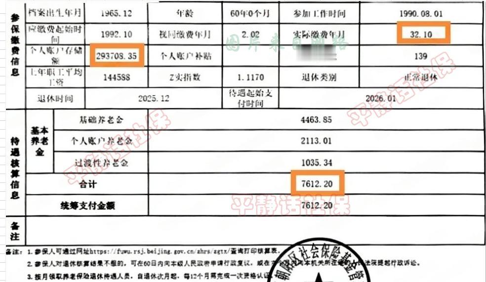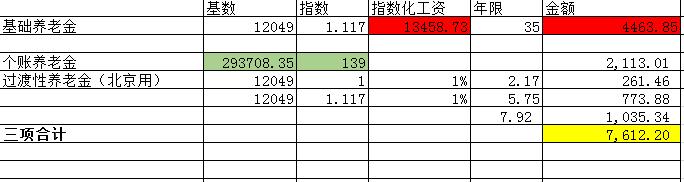 北京养老金! 北京朝阳区退休,男性,1965年12月生人,2025年12月退休,60岁整,没有选择延长。累计缴费35年,指数1.1170。 北京核定表的年月标识的比较特殊,例如表格中视同缴费年限2.02,这是2年2个月的意思,折算成年是2.17年,并不是2.02年(这点似乎很多人吐槽过) 核定结果:基础养老金4463.85元,个人账户养老金2113.01元,过渡性养老金105.34元,共计7612.20元。 平均每年7612/35=217元 过渡性养老金是由两部分组成,分别为: 12049*1*2.17*1%=261.46元 12049*1.117*5.75*1%=773.88元 两项合计为过渡性养老金的总数1035.34元。 养老金的高低不能单纯用总数判断,要结合缴费年限和档次。本案例中缴费年限仅35年,养老金可达到7600元,年均水平约217元 / 年,性价比已是较高水平。