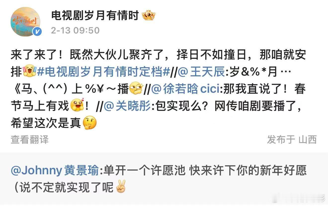 岁月有情时官宣定档岁月有情时要播了 2月13日,领衔主演的电视剧《岁月有情时》官宣定档。黄景瑜发文:“单开一个许愿池 快来许下你的新年好愿(说不定就实现了呢 ”关晓彤:“包实现么?网传咱剧要播了,希望这次是真🤔 ”随后,表示:“来了来了!既然大伙儿聚齐了,择日不如撞日,那咱就安排”