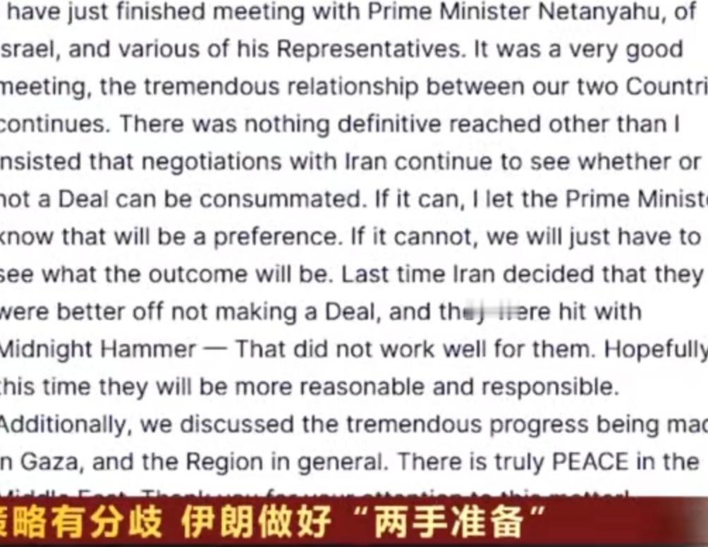 特朗普与内塔尼亚胡会晤后表示,美以将继续推动对伊朗谈判,若无法达成协议则不排除其他选项。双方在对伊施压策略上存在分歧,而伊朗则做好“两手准备”,既愿接受核查,也展示了导弹、无人机等国防实力。这一系列互动,让中东局势的走向变得更加复杂难料。