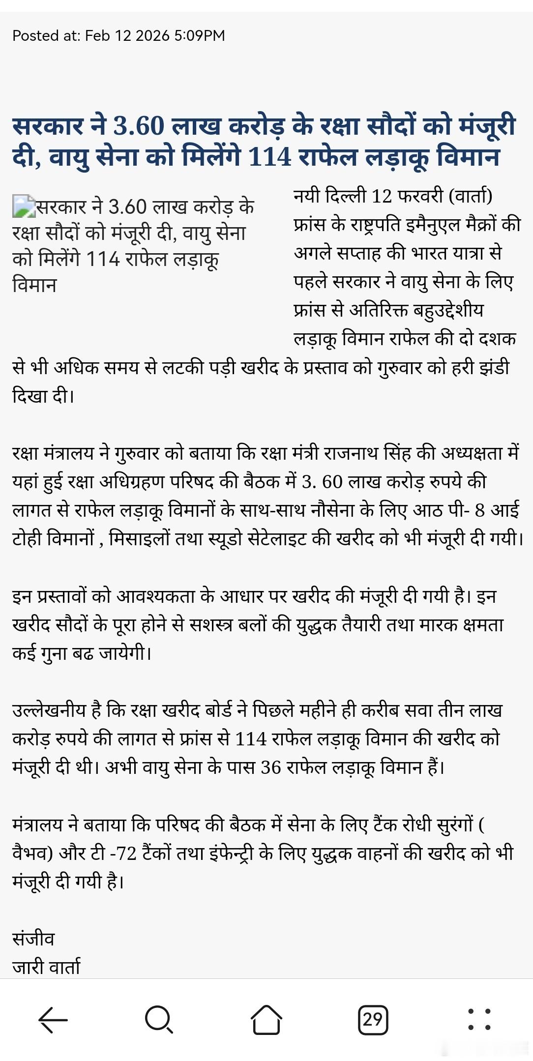 印度要买114架阵风政*批准了价值3600亿卢比的国防采购,空军将获得114架“阵风”战斗机新德里2月12日(通讯社)——在法国总统埃马纽埃尔·马克龙下周访问印度之前,印度政府于周四批准了空军从法国购买多用途战斗机“阵风”的提案。这项采购计划已悬而未决超过二十年。国防部表示,在国防采购委员会会议上,由国防部长拉杰纳特·辛格主持的会议批准了总价值3600亿卢比的多项采购,包括114架“阵风”战斗机、海军的8架P-8I侦察机、导弹以及模拟卫星。(印度联合新闻网)