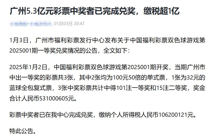 春节期间为大家带来2025年度系列盘点,带大家回顾2025全年最精彩瞬间,本期是系列第一条:2025年度最高奖的诞生。在2025001期即新年第一期,广州彩友独揽101注头奖共计5.3亿元震动彩市,不仅是新年001期就锁定全年最高奖,而且历史第4注超5亿巨奖,并开启了全年超11注亿元大奖的征程。 不过亿元中的太多也不是好事,舆论倾向普遍不好,直接间接导致了新规出台,亿元巨奖正式成为历史,至少短期内都不会变动啦!