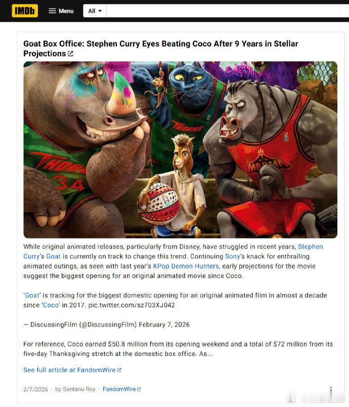 库里制片动画评级给到夯库里又赢了,这次不在球场在制片间!《奇迹梦之队》烂番茄86%新鲜度,外网自来水按头安利停不下来。被评“迪士尼该学学的动画”,篮球迷跪求加场。首周末票房挑战《寻梦环游记》