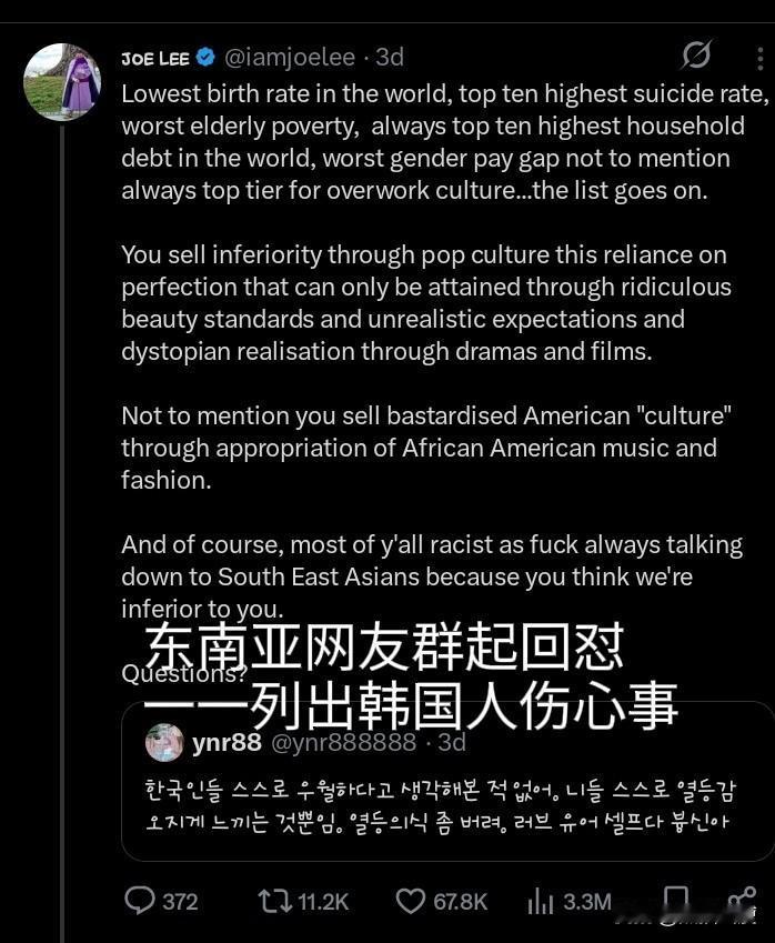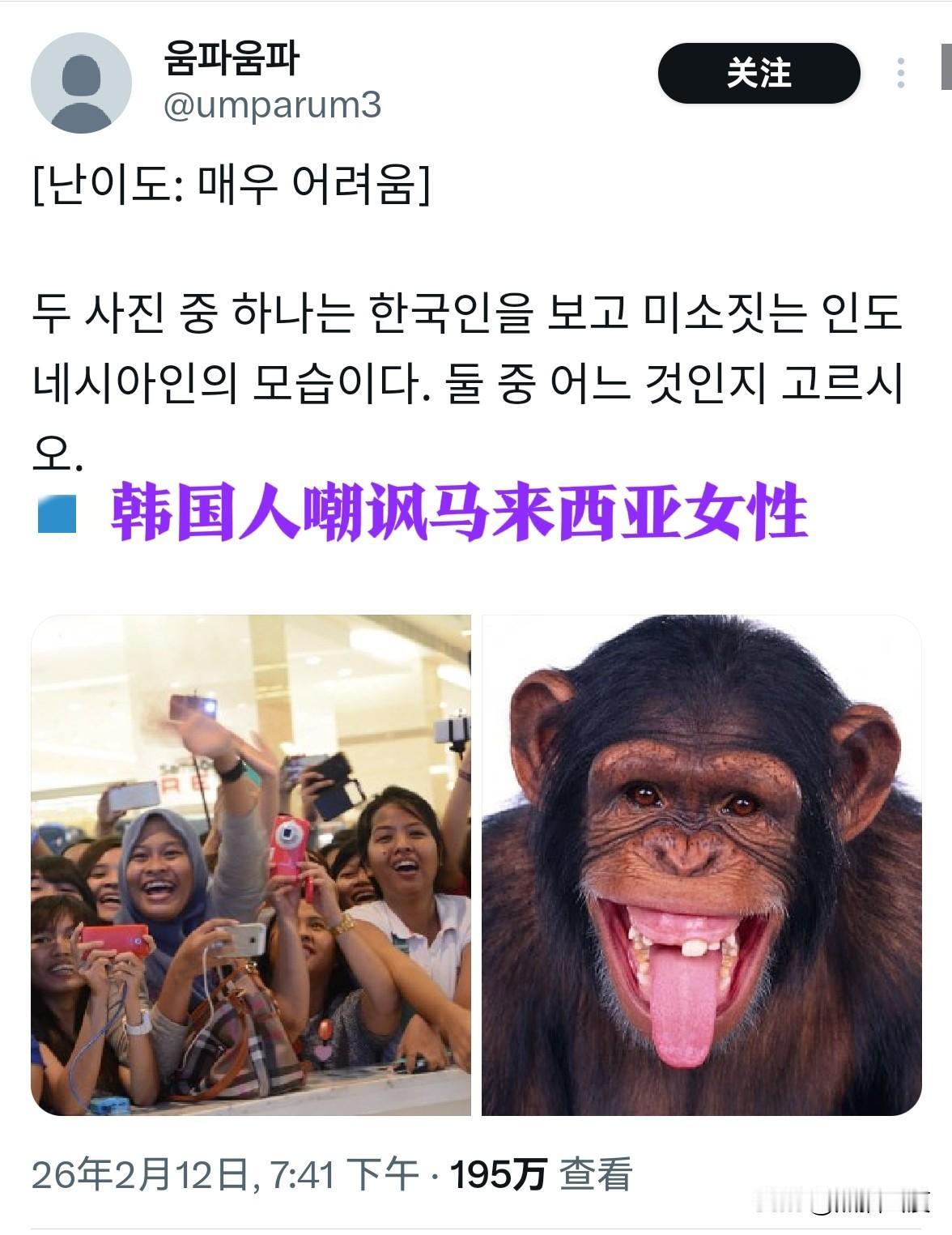 全世界都在嗑瓜子关注:东南亚第一次真正团结一心——而令这事情能成的人是韩国人。 现在国际网络上东南亚人联合在一起,集体回怼韩国人。评论区全在轰炸,一片混乱,东南亚网友将韩国人心中所有伤痕,从出生率,语言,整容脸到做那谁的狗腿子一一扒出,再一一撒盐。 最初起因是一群韩国人在马来西亚携带违规相机强闯演唱会,被拒后网上叫骂,上升到马来西亚女性和种族层面。于是东南亚网友很快抛弃前嫌、联合起来回怼,韩国一方除了贴上猩猩照片外,根本无力招架。 东南亚网友现在称韩国人为“最想在亚洲当美国人的人”。 同时他们还附上大量明显没有整容的韩国足球队队员的照片……力证Kpop那些脸都是假的。 ——【谢天谢地,我的基因让我不需要像韩国人一样为一张照片而在脸上开刀】 ——【韩国人真实的样貌只能在朝鲜看到】[融化]