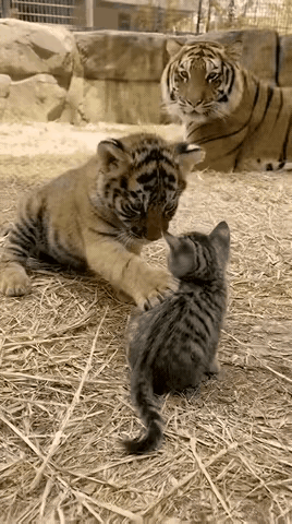 小老虎看到猫咪,好像看到了一个缩小版的自己,感到非常亲密。小猫咪看到小老虎也想见到亲人一样,伸出胳膊和小老虎抱在一起。虎妈妈在一旁默默的看着这一切,脸上满是温柔。