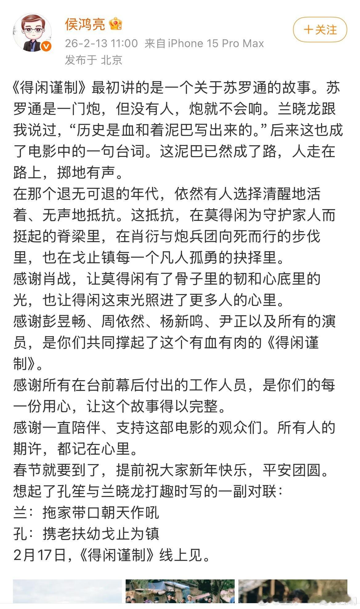 拖家带口朝天作吼,携老扶幼止戈为镇。肖战得闲谨制2.17日全网上线,侯鸿亮发长文感谢台前幕后工作人员。