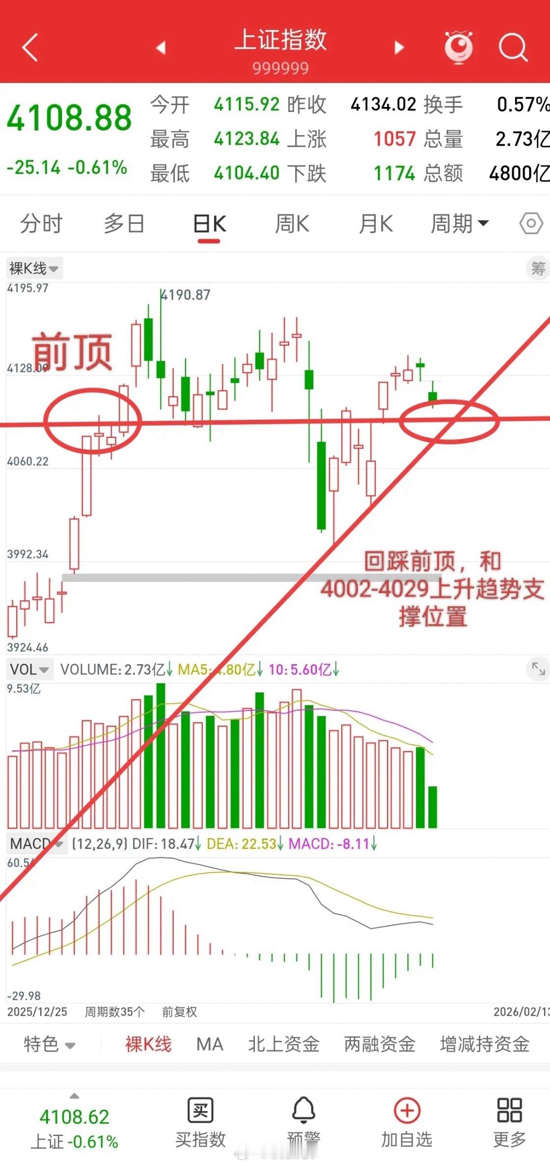 4002-4029两个低点构筑的上升趋势支撑,大概在4085左右。