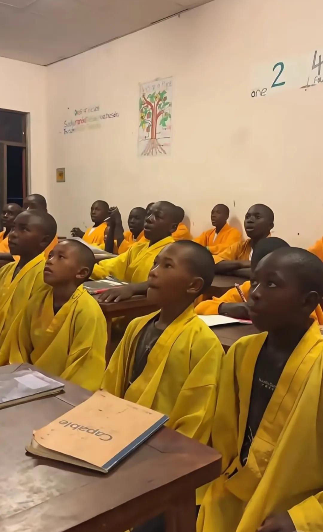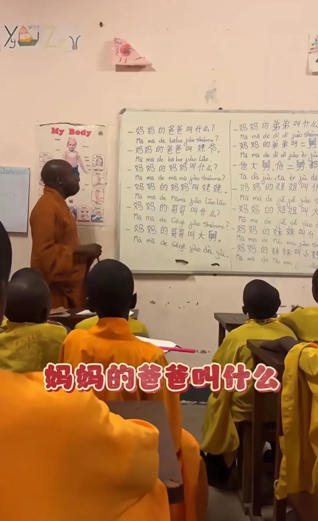 黑人在教孩子学中国话,就是这校服感觉有点奇怪,有点像僧服。