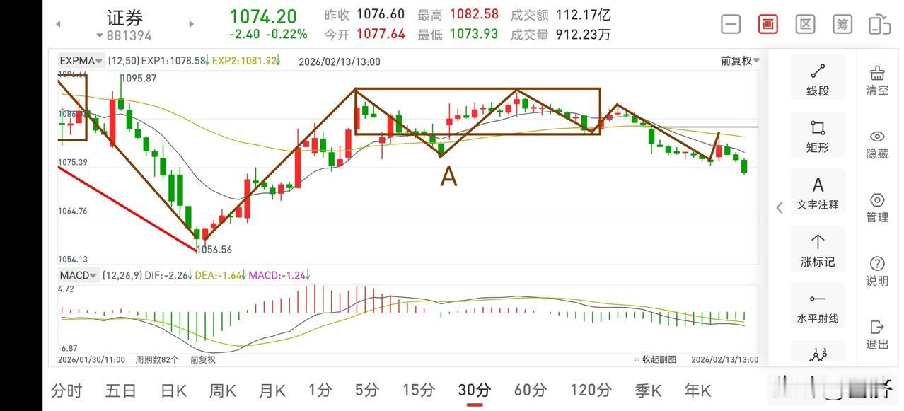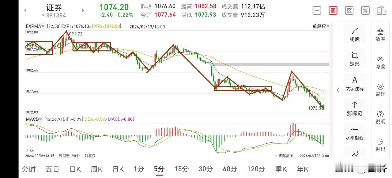 聊聊证券板块(2026.2.13) 证券这个“渣男”,在昨天出利好的情况下,还是未能回补上方缺口,真的是太弱了,节前最后一天居然会收阴,让人无语。从沪指和证券板块来看,目前正在回踩日线一笔,从而构筑双底。证券板块虽然弱,但走势并没有走坏,只能耐心等待了。 1.从30分钟图一上看,上午的冲高形成了30分钟的二卖,既然二卖出现了,还是要选择回避一下,能避开一至二根中阴线也是好的。 2.从5分钟图二上看,目前重新回到了中枢下方运行,只要是在中枢下方,都是一种弱势的表现,下午继续下探恐怕已成定局。但是再破新低的概率也是极小的,从一些先行调整的个股来看,都没有再创新低,所以并没有大的风险,只是在底部熬的时间会比较长。 3.商业航天妖龙预计今天会拉出大阳线,到时候也可考虑减一点仓位,因为大阳线过后也是回踩日线一笔。但总体走势无忧,后期可继续考虑看多。证券板块动态 头部券商有哪些 股市趋势分析