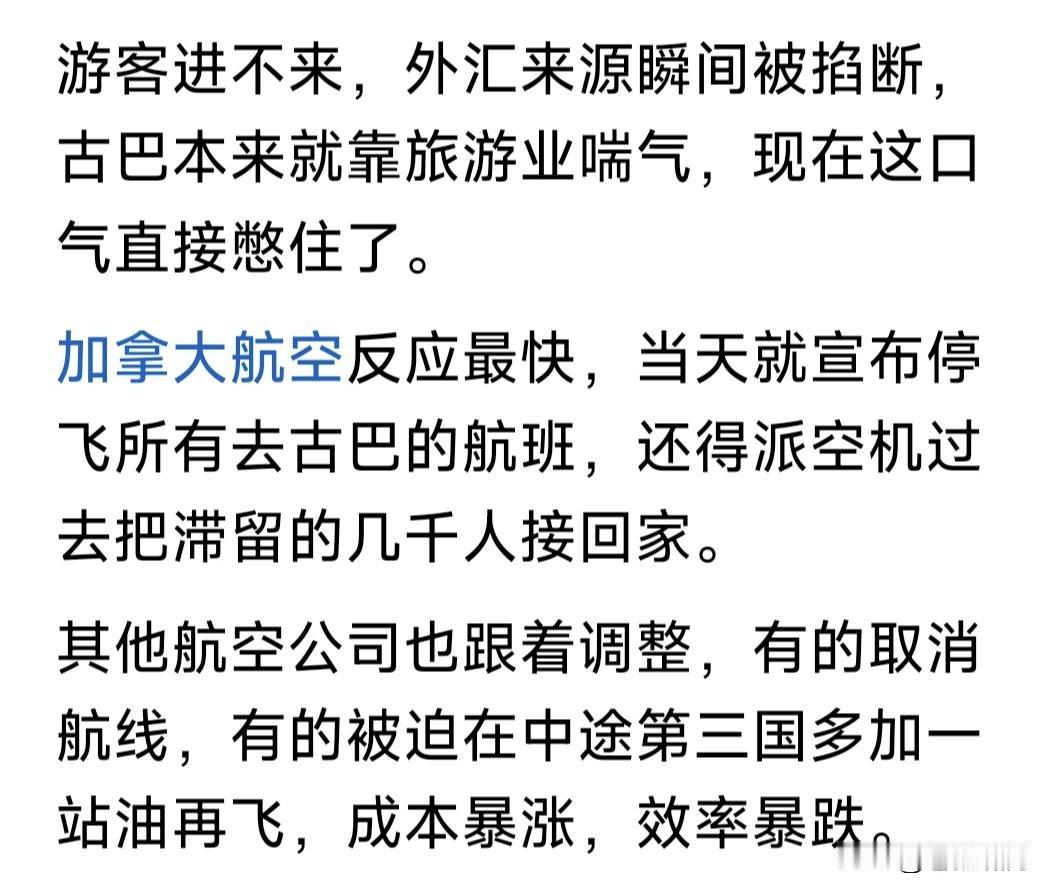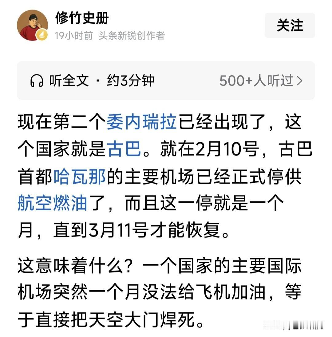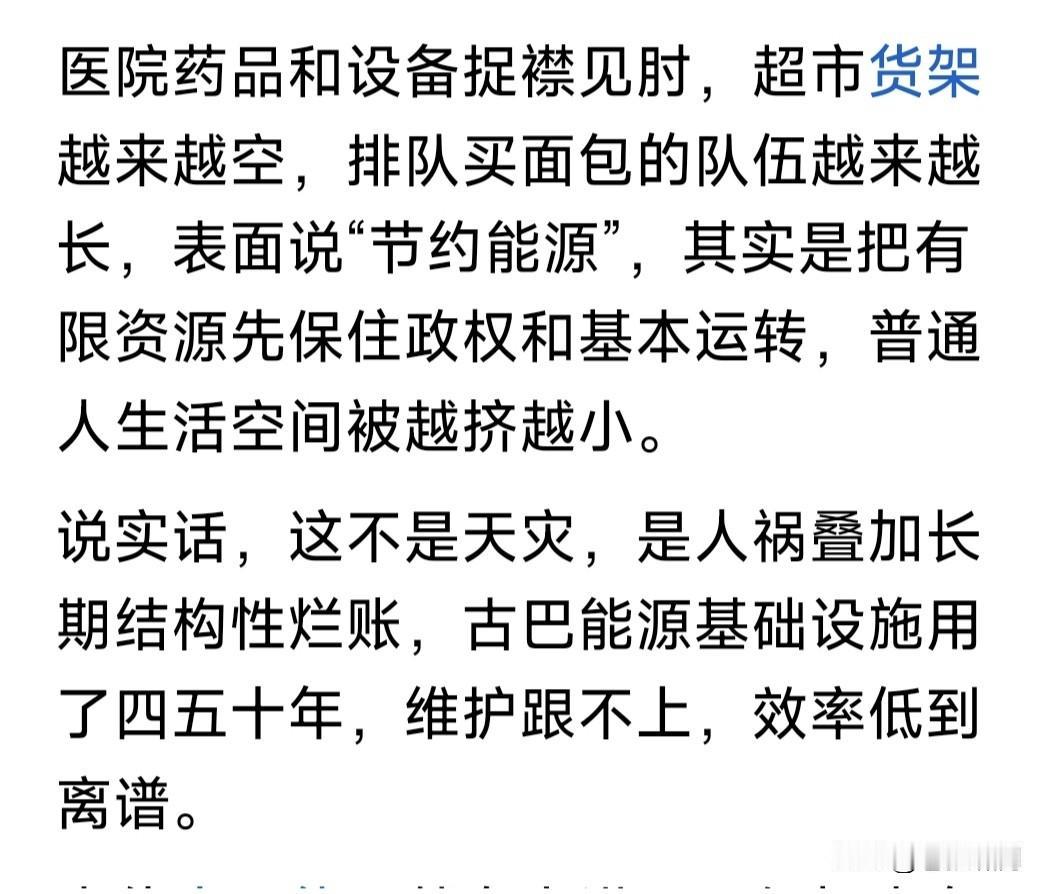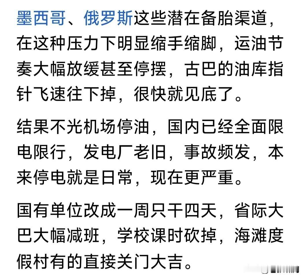 有点替古巴担忧!一边上街喊口号:我们绝不屈服,美帝吓不倒我们!一边机场航空断油,公路加油站排长队。 古巴主要靠委内瑞拉供油,墨西哥和俄罗斯占小部分。美帝抓捕马杜罗,切断委古供应线;二级制裁威胁下,墨也停止供油;俄油轮出不去,咋整呢? 没有石油供应,就炼不出汽油,飞机场和公路加油站就得断油。没有柴油供应发电,影响到各行各业运转,工厂学校医院超市,仅靠少量光伏可以吗? 有人赞古巴真硬气,敢与美帝硬碰硬!泰山压顶不弯腰,风吹雨打花更红!殊不知有些人并不受影响,受苦受难的都是老百姓!这种硬气到底值不值? 苍狼看图只想笑,这些“老爷车”是谁制造的?什么时候制造的?由此想到我们国家,大街上小汽车成群结队,江南农村跑的小汽车,也比这些车好啊! 我们今天取得的成绩,都是改革开放的功劳!因此再次感谢邓小平的睿智,党中央的英明!然而疑问的是,为何古巴不能像我们一样进行改革开放呢? …………