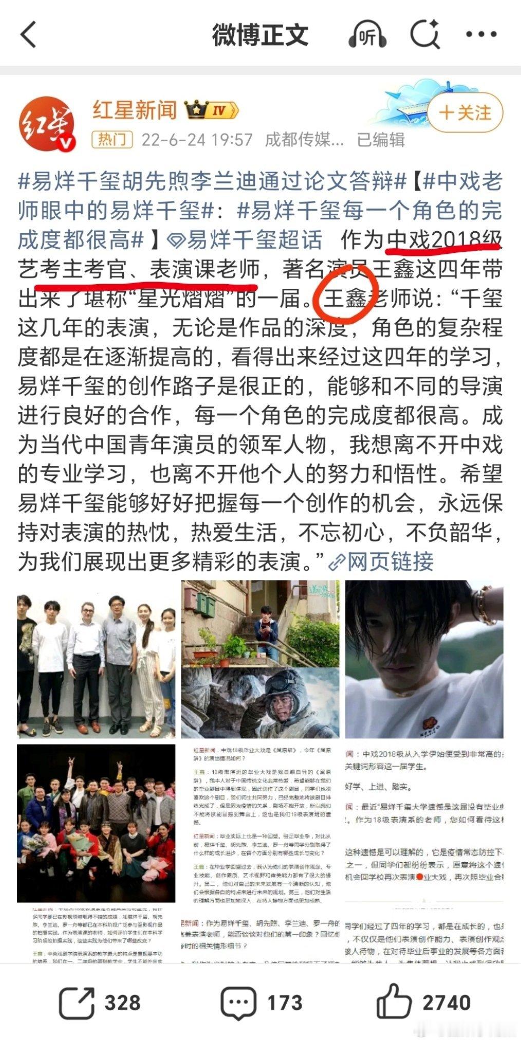 王鑫被查王鑫是中戏2018级艺考主考官、表演课老师👀,那一届有易烊千玺、胡先煦、李兰迪、罗一舟。曾执导文淇、王和参演的《屈原辞》,话剧《四川好人》等