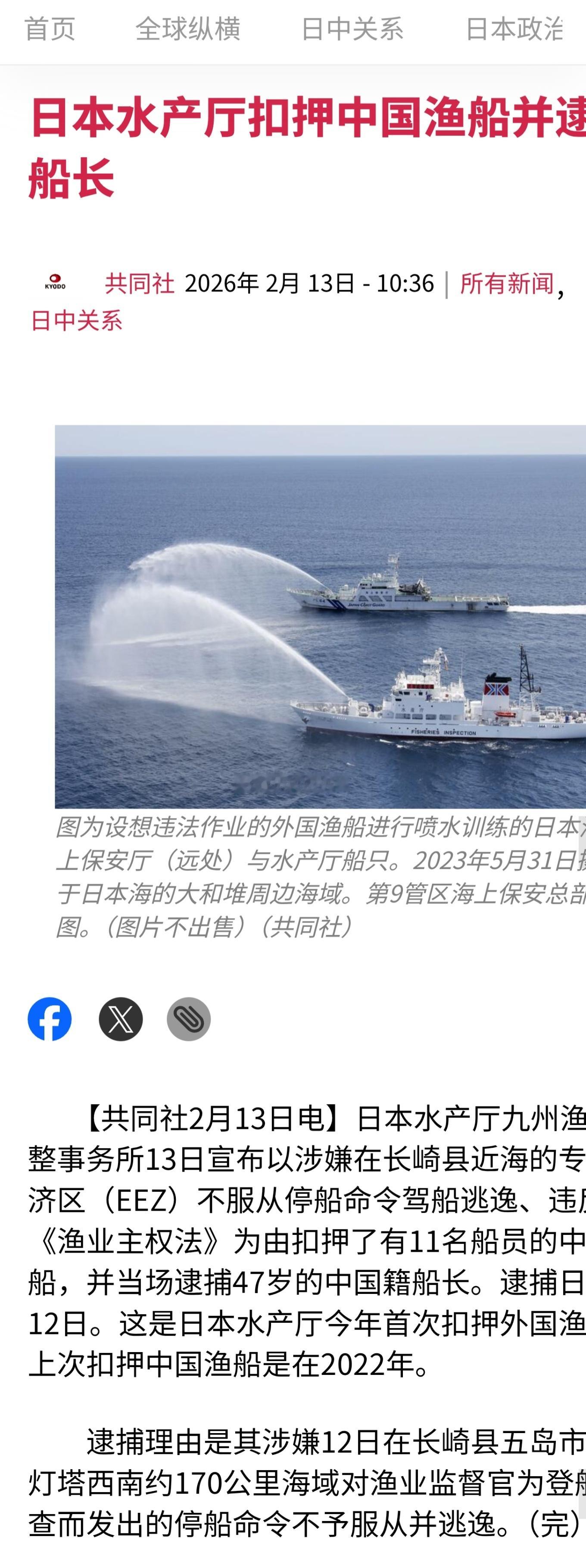 日本当局再次扣押中国大陆渔船 日本共同社报道,日本水产厅2月12日扣押一艘中国渔船,并拘捕47岁中国籍船长,指涉事的中国渔船在长崎县专属经济区内拒绝执行停船命令。报道指,涉事渔船共有11名船员,事发时试图逃避,日本渔业管制官员在长崎县五岛市西南约170公里海域登船检查。这是自2022年以来,日本水产厅首次扣押中国渔船,也是当局今年扣押的第一艘外国渔船。