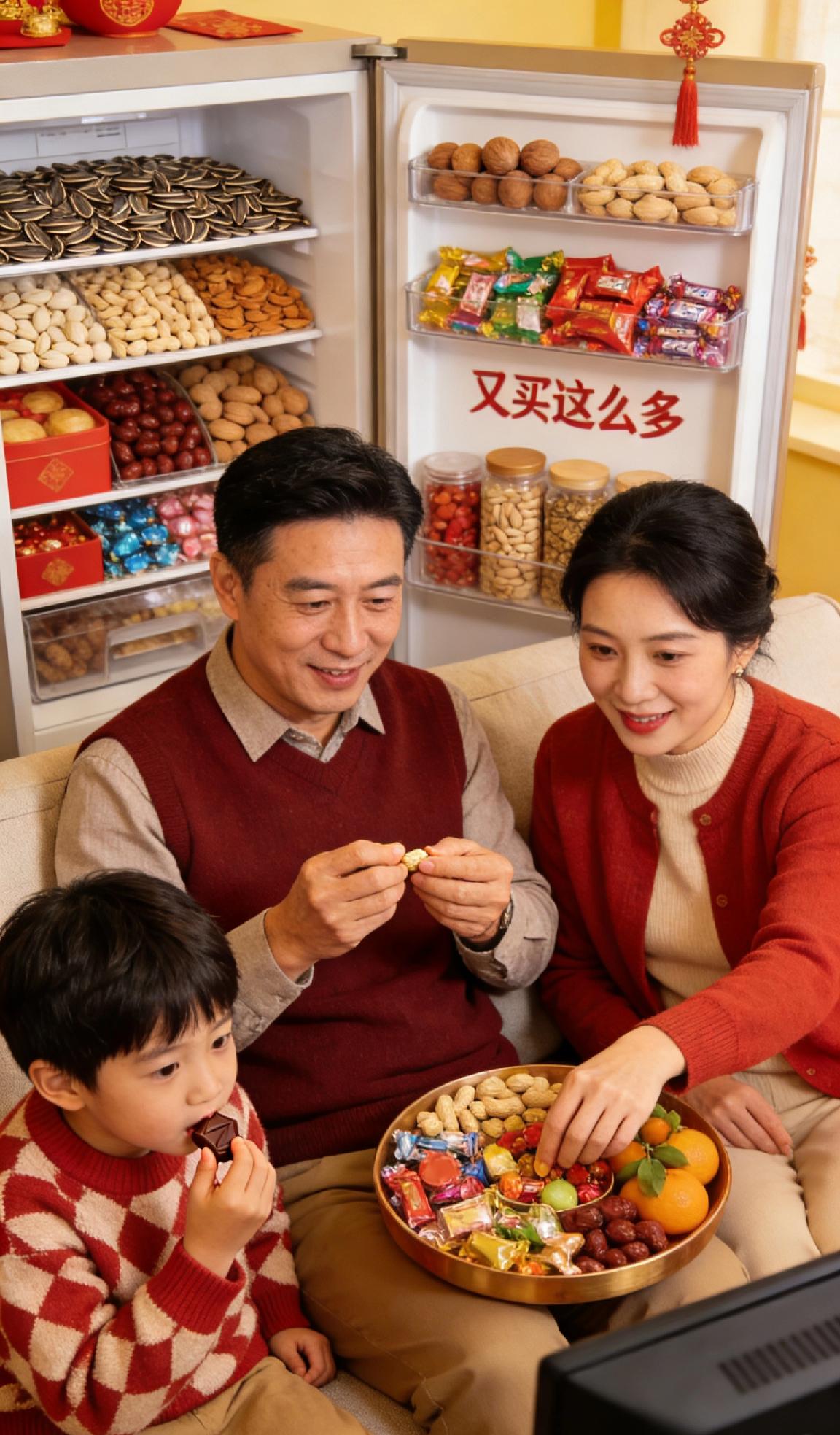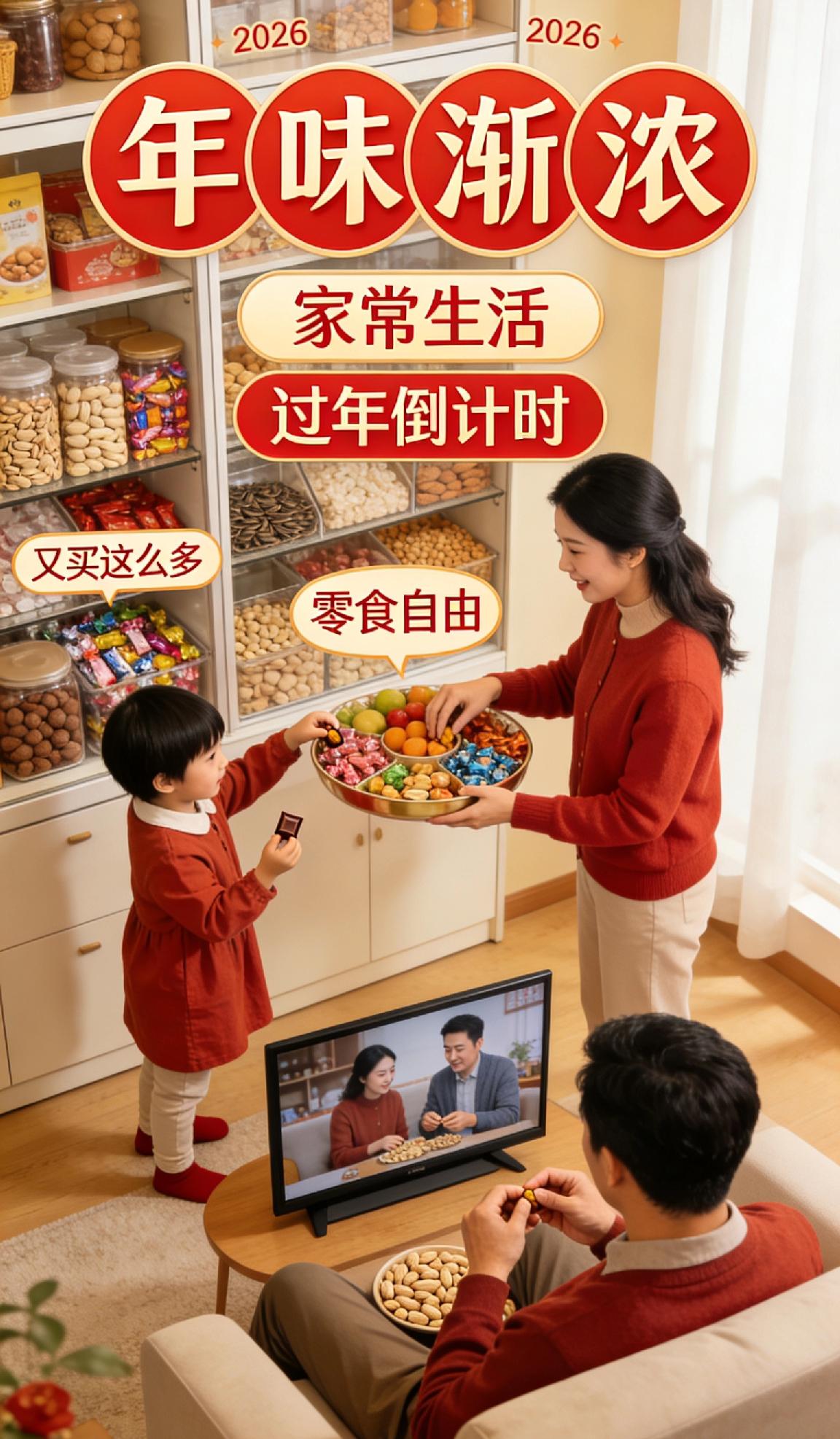 过年的脚步越来越近,家里悄悄开启了“囤货模式”。 瓜子、花生、糖果、坚果,一样样填满零食柜,连空气里都是甜丝丝的年味。小朋友偷偷捏一颗巧克力,老爸剥着花生看电视,老妈念叨着“又买这么多”,手上却在往果盘里添新花样。 人间烟火气,最抚凡人心。 其实过年最动人的,从来不是多丰盛的大餐,而是一家人挤在沙发上,你一把我一把,边吃边聊,把寻常日子过成热热闹闹的团圆。 年味渐浓 家常生活 过年倒计时