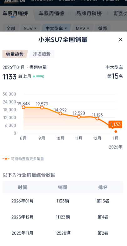 雷军昨天在直播里宣布,随着前几天最后一辆车的下线,初代SU7已正式停产。 并且他还分享了一个关于最后一台SU7车主的小故事,雷军表示:最后一代SU7的购买者是一个西安的米粉,此前一直在国外没有办法购买SU7,这次回国之后特意要求买初代的SU7,而不是新上市的,作为留念。 上市两年来,初代SU7引发了巨大的轰动、鲸吞了滔天的销量。而1月份销量排行榜公布,SU7的月交付降至千于台,也到了产品生命周期了,换代是再正常不过的事情了!