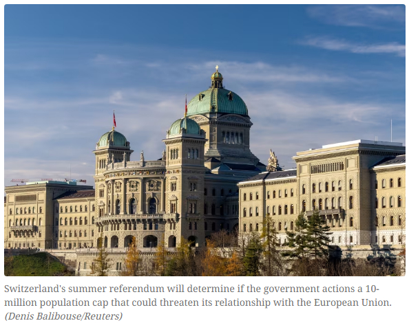 这项提案由瑞士主要右翼政党——瑞士人民党提出,其中要求,一旦瑞士人口达到950万(目前约为910万),政府就必须拒绝新移民,包括寻求庇护者和外籍居民的家属。如果瑞士人口达到1000万,瑞士政府必须终止与欧盟的自由流动协议,该协议允许瑞士与欧洲大陆其他国家之间人员的自由流动。
