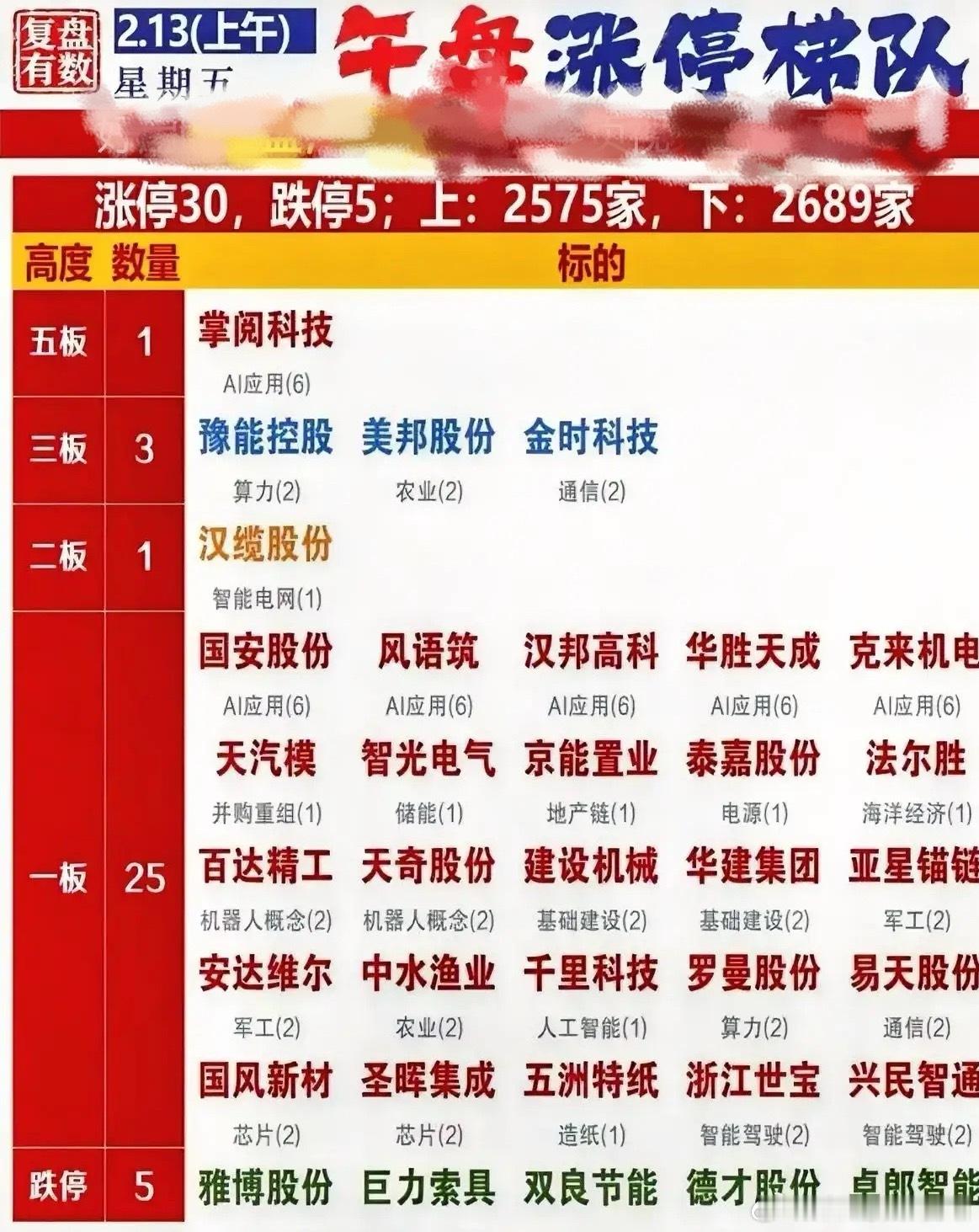 今日A股市场涨跌家数接近,上涨2575家,下跌2689家,涨停30家,跌停5家。涨停梯队中,五板仅掌阅科技,三板有3家,二板1家,一板25家,AI应用、机器人概念、军工等板块个股表现突出,跌停股数量较少,市场情绪分化明显。个股梳理分析1. 掌阅科技:作为AI应用板块个股,连续五板涨停,带动板块内多股跟风。公司在数字阅读领域布局AI技术,近期资金关注度持续提升,股价强势上行。2. 豫能控股:属于算力概念,连续三板涨停,受益于算力基础设施建设提速。公司布局新能源与算力业务,近期资金持续流入,股价表现强势。3. 美邦股份:隶属农业板块,连续三板涨停,受农业政策利好及农产品价格波动影响。公司主营农药制剂,行业景气度有所提升,股价跟随板块上行。4. 金时科技:归属通信板块,连续三板涨停,受益于通信基础设施建设及5G应用拓展。公司在通信设备领域有技术积累,近期股价表现活跃。5. 汉缆股份:属于智能电网板块,二板涨停,受益于电网投资加码及智能电网建设推进。公司主营高压电缆,订单情况良好,行业景气度提升带动股价走强。6. 国安股份:AI应用板块个股,一板涨停,受AI技术落地及应用场景拓展影响。公司在信息安全领域融合AI技术,近期资金关注度有所提升。7. 风语筑:AI应用板块个股,一板涨停,受益于AI在数字文旅领域的应用拓展。公司主营数字展示技术,AI赋能业务升级,近期股价跟随板块上行。8. 汉邦高科:AI应用板块个股,一板涨停,受AI在安防监控领域的应用深化影响。公司在视频监控领域布局AI技术,行业需求有所提升,股价表现活跃。9. 华胜天成:AI应用板块个股,一板涨停,受益于AI算力服务及行业解决方案需求增长。公司在云计算及AI领域有技术积累,近期市场关注度较高。10. 克来机电:AI应用板块个股,一板涨停,受AI在智能制造领域的应用推进影响。公司主营汽车电子及智能制造装备,AI赋能生产效率提升,股价表现强势。11. 天汽模:并购重组概念个股,一板涨停,受益于并购重组预期及汽车行业复苏。公司主营汽车模具,行业景气度有所回升,近期资金关注度提升。12. 智光电气:储能板块个股,一板涨停,受储能政策利好及行业需求增长影响。公司布局储能系统及电力电子设备,行业景气度提升,股价跟随板块上行。13. 京能置业:地产链板块个股,一板涨停,受益于地产政策宽松及销售预期变化。公司主营房地产开发,行业政策利好推动股价近期走强。14. 泰嘉股份:电源板块个股,一板涨停,受新能源电源需求增长及行业技术升级影响。公司主营锯切工具及电源设备,行业景气度提升,股价表现活跃。15. 法尔胜:海洋经济板块个股,一板涨停,受益于海洋经济发展规划及相关产业政策。公司在金属制品及海洋工程领域布局,近期市场关注度较高。16. 百达精工:机器人概念个股,一板涨停,受机器人产业政策利好及行业需求增长影响。公司主营压缩机零部件,机器人产业链景气度提升,股价跟随板块走强。17. 天奇股份:机器人概念个股,一板涨停,受益于智能制造及机器人应用场景拓展。公司主营自动化装备,机器人业务布局深化,近期股价表现强势。18. 建设机械:基础建设板块个股,一板涨停,受基建投资加码及项目开工提速影响。公司主营工程机械租赁,行业需求有所提升,股价跟随板块上行。19. 华建集团:基础建设板块个股,一板涨停,受益于基建政策支持及工程设计需求增长。公司在工程咨询及设计领域有优势,行业景气度提升推动股价走强。20. 亚星锚链:军工板块个股,一板涨停,受军工订单增长及国防建设需求提升影响。公司主营船用锚链及海洋工程系泊链,军工业务有所拓展,近期市场关注度提升。21. 安达维尔:军工板块个股,一板涨停,受益于军工产业升级及航空航天领域需求增长。公司在航空电子及机载设备领域布局,行业景气度提升,股价表现活跃。22. 中水渔业:农业板块个股,一板涨停,受渔业政策利好及水产品价格波动影响。公司主营水产品加工及销售,行业景气度有所提升,近期资金关注度提升。23. 千里科技:人工智能板块个股,一板涨停,受益于AI技术突破及应用场景拓展。公司在人工智能算法及解决方案领域有布局,近期市场关注度较高。24. 罗曼股份:算力概念个股,一板涨停,受算力基础设施建设及数据中心需求增长影响。公司主营照明工程及算力相关业务,行业景气度提升,股价跟随板块上行。总结今日午盘,A股涨停梯队呈现高板数量少、一板数量多的特点,热点集中在AI应用、机器人概念、军工等板块。高板个股稀缺,一板个股覆盖多个细分领域,市场情绪分化,板块轮动较快。