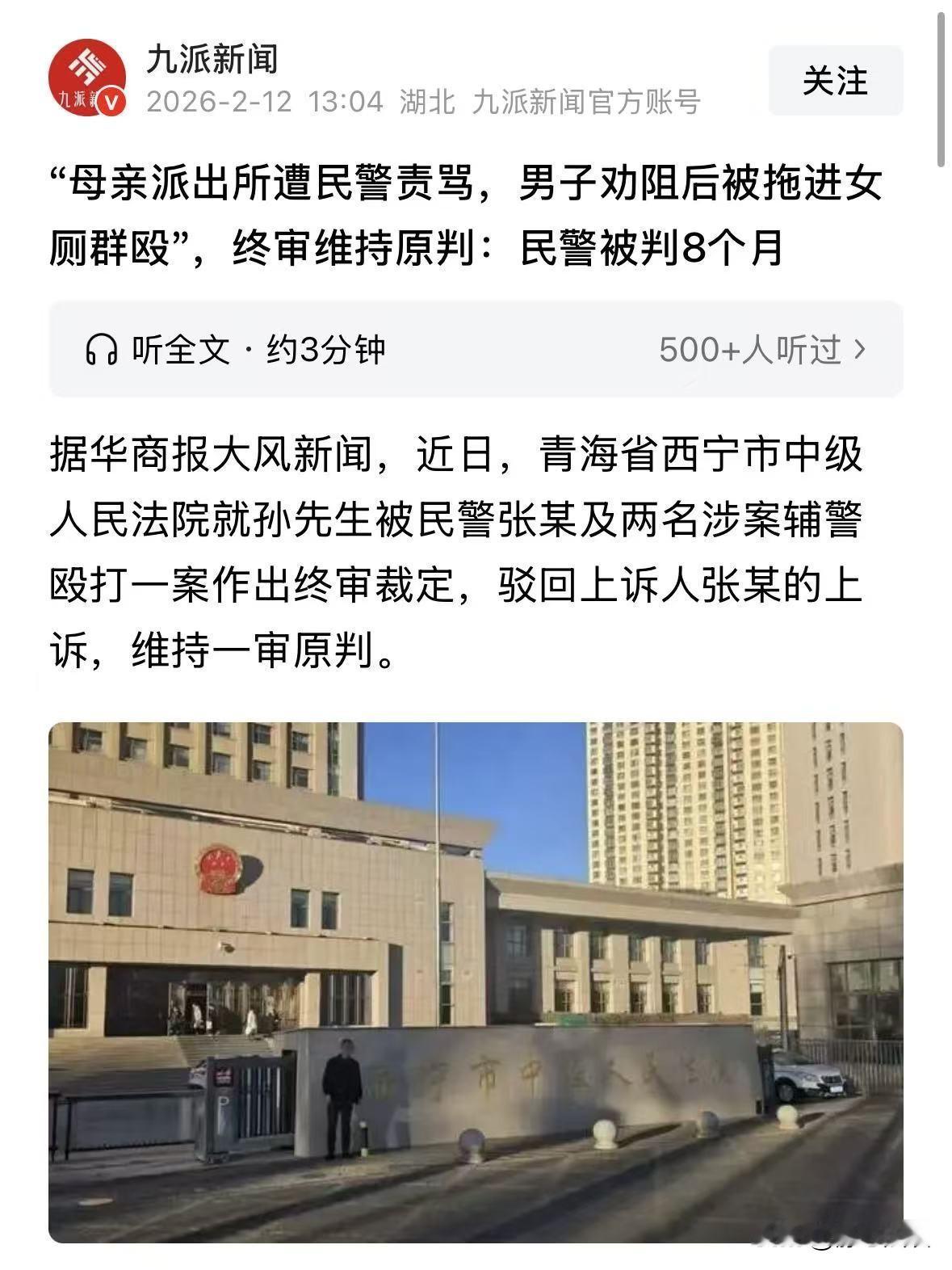 青海西宁,男子母亲因河酸扫码异常,被带到派出所,母亲就此事跟民警解释,谁知却遭到对方责骂,男子见状不想让母亲把事情严重化,就告诉母亲不要再说,谁知道此举引发对方不满,竟然叫人合力将男子拖到女厕所殴打,打完了还没完,又进来一辅警对男子拳打脚踢,男子受伤后经鉴定,右侧肩胛骨骨折,轻伤二级,部分地方擦伤,事后,涉事三人因故意伤害罪获刑,可其中一个人不服,提起上诉,二审是这样判的! 2022年8月29日,孙先生的母亲脚受伤,行动不便,在家躺了好几天,一直没下楼。 当天早上接到检查通知,孙先生一早就陪着母亲下楼去做 河 酸。 谁知道扫码显示异常,社区工作人员一看码不对,当场就报了警。 没一会,民警赶到现场,直接把孙先生和他母亲,一起带到了派出所。 到了所里,民警开始询问情况,老人家本来就因为脚伤、久未出门心里慌,又觉得自己没做错事,就一遍一遍跟民警解释。 自己这些天因为受伤没下楼,所以前几天就没检查,这不脚伤稍微好了一点,就叫儿子带自己下来,没想到就有了问题。 可负责询问的民警张某,一点耐心都没有,没听几句就当场责骂老人。 语气特别冲,完全不给长辈留一点情面、孙先生在旁边看着,心里又心疼又着急。 他想着母亲年纪大了,在派出所这种地方,跟人家争来辩去,只会把小事闹大。 对谁都没好处,为了息事宁人,他赶紧劝母亲先别说了。 就这么一句劝母亲的话,没顶撞、没骂人、没闹事,谁能想到,直接把张某给惹炸了。 张某当场就恼羞成怒,可能觉得孙先生这是不给他面子、顶撞他。 张某直接招呼一名辅警,两个人上来就架住孙先生,不顾反抗,强行拖拽到派出所一楼的女卫生间里对其殴打。 没过一会,又进来一名辅警对着孙先生踢踹。 三个人在狭小封闭的女厕所里,合力围殴打一个手无寸铁的普通人。 孙先生根本没法还手,只能硬生生扛着拳打脚踢,疼得浑身发抖,直到被打得撑不住才罢休。 等孙先生被放出来的时候,浑身是伤,疼得站都站不稳,脸上、身上全是擦伤,骨头也疼得钻心。 事后孙先生去医院检查,报告结果显示右侧肩胛骨骨折。 还有头部外伤、头皮挫伤、面部软组织挫伤等等。 经过正规司法鉴定,结果是轻伤二级,其他部位多处轻微伤。 无缘无故被群殴,孙先生又委屈又无奈,他想给自己讨个说法。 可对方提出拿钱私了,而且说内部会处理大人的人。 孙先生想着只要能处理那些人,那也不至于拖着没完,就收下了这笔钱。 可没想到,收了钱之后,打人的几人根本没被处理,甚至还矢口否认打过他。 孙先生彻底寒心,他没有妥协,而是四处举报、找证据,前后做了三次司法鉴定,用权威报告固定自己的伤情。 折腾了很久,终于以故意伤害罪立案侦查,把涉案的民警张某和两名辅警,全都移送检察院起诉。 《刑法》第234条:故意伤害他人身体的,处三年以下有期徒刑、拘役或者管制。 犯前款罪,致人重伤的,处三年以上十年以下有期徒刑。 一审判决民警张某,判处有期徒刑8个月、另外两名辅警,各判处有期徒刑8个月,缓刑一年。 《民法典》第1179条规定:侵害他人造成人身损害的,应当赔偿医疗费、护理费、交通费、营养费、住院伙食补助费等为治疗和康复支出的合理费用,以及因误工减少的收入。 同时,三名被告人又赔偿了孙先生188966元,加上之前的10万,总共赔偿近29万。 但钱是一回事,公道是另一回事,孙先生要的从来不是单纯的赔偿,而是一个公道。 本来以为一审判决,这事就完了,可张某不服,提起了上诉。 他表示鉴定委托主体不对、鉴定依据不足、甚至说孙先生的伤可能是别的原因造成的,自己无罪。 2026年1月12日,二审法院认为一审判决认定的事实清楚、证据确实充分,遂驳回上诉,维持原判。 从2022年到2026年,孙先生熬了整整三年多。 这三年里,他要养伤、要找证据、要跑部门、要打官司,承受的身体痛苦和精神压力,普通人根本想象不到。 但他一直没放弃,终于等到了正义落地的这一天。 孙先生后来说,其实看到张某被带走的时候,心里五味杂陈。 他不是想报复谁,只是觉得,作为普通老百姓,被无故殴打,想要讨个公道。 对于这一结果,不少人拍手称赞,这几人就是罪有应得,给你全力是用来保护百姓的,不是用来耍威风、泄私愤的。 对此,你怎么看这件事情! @静心法谈 学法辨是非,慬法不吃亏。