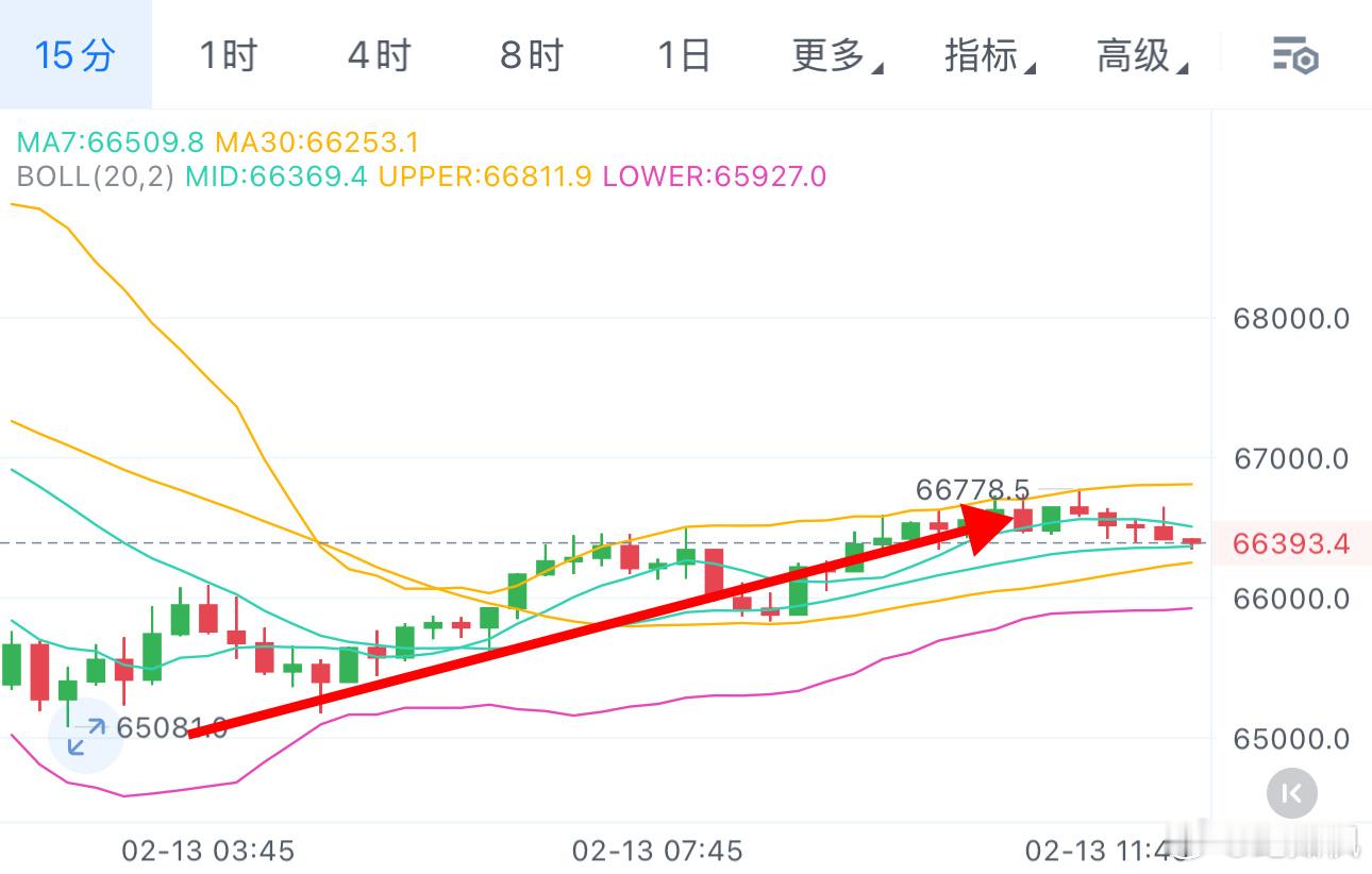 整体趋势低位震荡,午间回踩66000-66500可以继续接多,目标依旧看6800