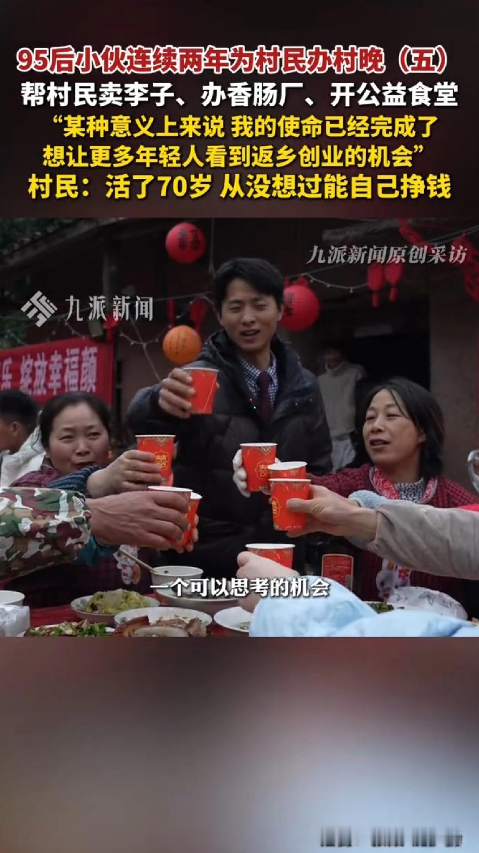 95后小伙连续两年为村民办村晚帮村民卖李子、办香肠厂、开公益食堂。 现在的年轻人真是太有担当了!南充仪陇洞磬沟村的95后小伙周建康就特别让人佩服。 他连续两年为村民办村晚,2025年1月26日晚那场村晚超热闹,170多人参与。为了扩大场地,全村老少齐上阵,老人拿镰刀,年轻人开挖掘机,小孩捡垃圾。 而且他还帮村民卖李子、办香肠厂、开公益食堂。这一系列操作,不仅让村里年味更浓,也给村民生活带来了实实在在的改变。 周健康表示:某种意义上来说我的使命已经完成了,想让更多年轻人看到返乡创业的机会。 村民:活了70多岁没想过自己还能挣钱。 越来越多的年轻人回乡创业,拍段视频带货,带领村里的老人提高收入。不用跑到外地也能提高收入,改善村貌。 像“名模坤”程中坤带火青吉村一样,周建康也用自己的方式让洞磬沟村越来越好。为这样的年轻人点赞!