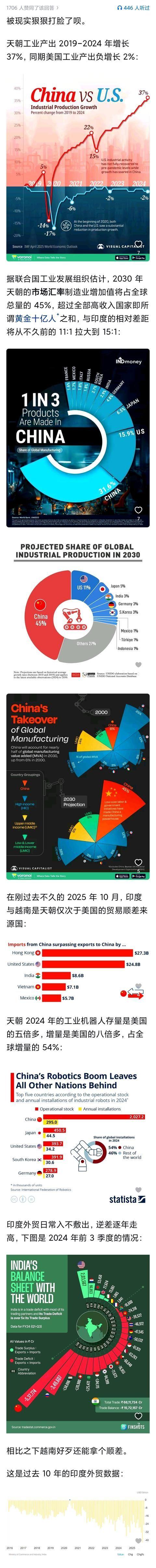 为什么现在没人提“外资撤离”“工业转移”“越、印崛起”了?几年前,外资撤离中国、工业转移越南印度、取代中国工厂的说法铺天盖地。可如今,这些声音悄然消退。贸易数据和经济指标给出答案:顺差创纪录,外资结构优化,周边国家成本优势缩小。真相如何? 中国2025年贸易顺差达1.19万亿美元,比2024年增长20%。出口总额升5.5%,进口持平。尽管美国关税影响,出口转向欧盟、东南亚与非洲。12月顺差1141亿美元,创纪录。美国贡献最大,其次印度与越南。这些国家从中国进口大量,形成顺差来源。对美出口降20%,对非洲升26%,对东南亚显著增长。中国制造商扩展全球市场,应对压力。 外资使用额7477亿元人民币,降9.5%,但新设外资企业70392家,增19.1%。制造业外资18551亿元,占24.8%。高科技外资24177亿元,电子商贸服务增75%,医疗设备制造增42.1%。瑞士、阿联酋、英国投资分别增66.8%、27.3%、15.9%。总量下滑,但结构优化,转向高端领域。产业升级中,低端产能淘汰与新技术并行。前10个月用电增5.1%,工业用电增10%,显示制造业活力。出口转向非美市场,规模扩张抵御关税。 越南工业租金升至每平方米25元,珠三角多地仅8元,成本接近。建厂主针对美出口,原料半成品多从中国运入,难建重工业链。劳动力成本约中国55%,但地租增30-40%。供应链靠中国,关税物流加总开支。2025越南时薪3美元,中国6.5美元,本地化率低,关键部件需进口中国韩国日本,库存管理复杂。胡志明市租金4.1美元,高峰8美元,与苏州4.2美元、东莞3.6美元相当。优势缩小,推动考虑柬埔寨孟加拉。自2019租金增70%,但竞争力存。河内租金5.3美元,北部北宁海防4.5-5美元。基础设施供应商生态吸引投资,供应链瓶颈限独立发展。 印度外资严峻,2025净流入仅3.53亿美元,降96.5%。全年流入810亿美元,撤出490亿美元,加对外投资利润汇回,净值近零。8月净负6.16亿美元,外流超159%。外国投资者净卖股票近170亿美元,亚洲外流最严重。年年调GDP计算,包括非传统项目,IMF评级低。制造业成本高于越南,中国时薪高于印度,基础设施政策波动致信心不足。11月净FDI负446百万美元,储备银行数据示遣返撤资主因。金融年净负,影响信心。政策改革推制造业,但全球不确定加剧外流。 西方经济学解释中国增长,提人口红利,指生育率降改变结构,促扩张。东亚1965-1990腾飞中发挥作用。但复制需教育健康劳动力政策,非仅人力成本。许多误以为低工资重现中国模式,忽略产业链深度市场规模。中国通过人口优化,实现快速增长。越南印度试图复制,供应链不完整成本上升限潜力。中国竞争力源于规模效率,非单纯劳动力优势。