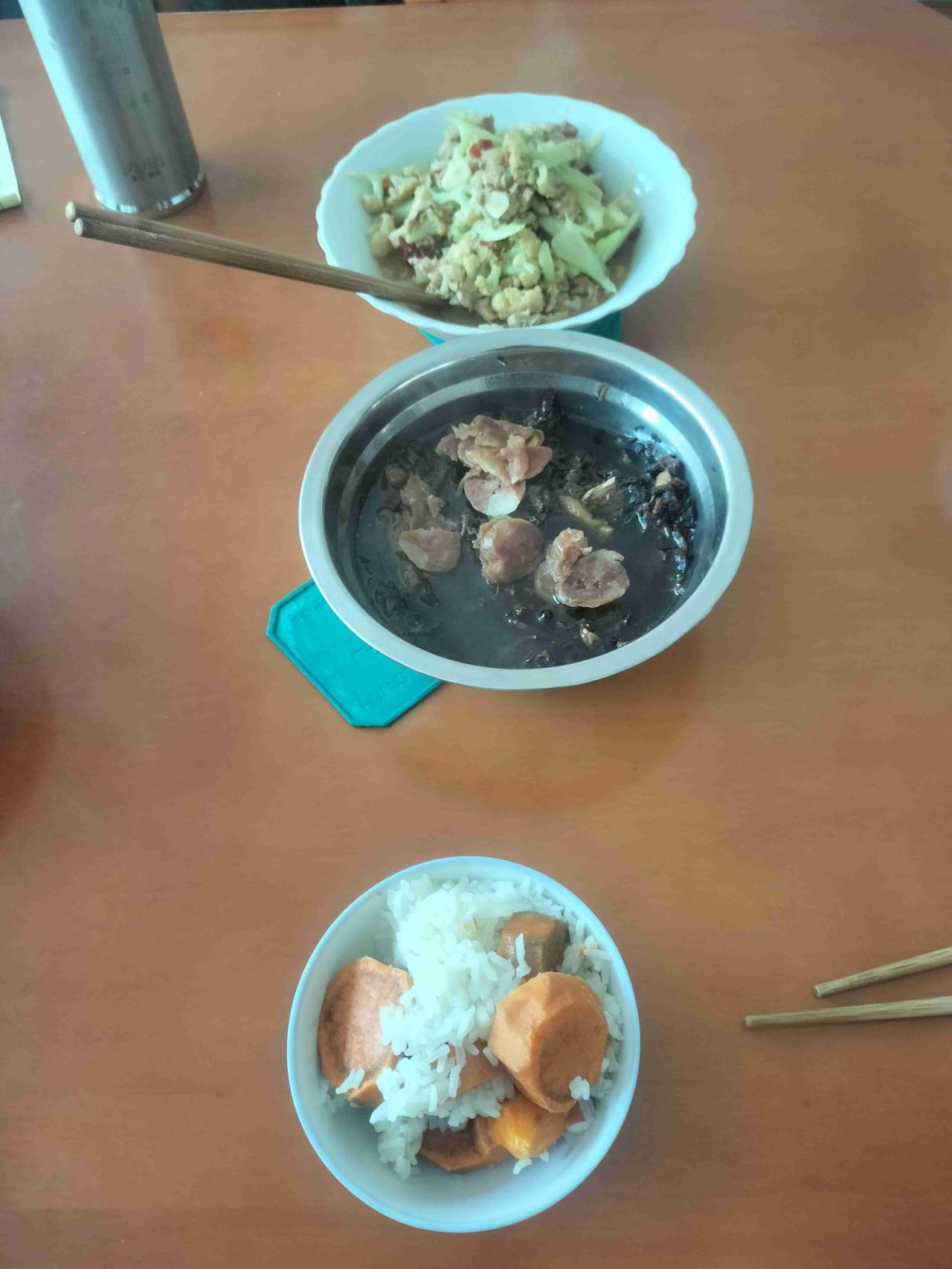 我的今日状态:😁轻松愉快 我这里的天气:☀️晴天,晒一晒我的中餐,两个菜,花菜炒肉,扣肉,扣肉没有肉放了几片香肠。米饭里夹了几片红薯,据说红薯含有纤维素,以前讨厌吃红薯,为啥?因为小时候吃得太多了。