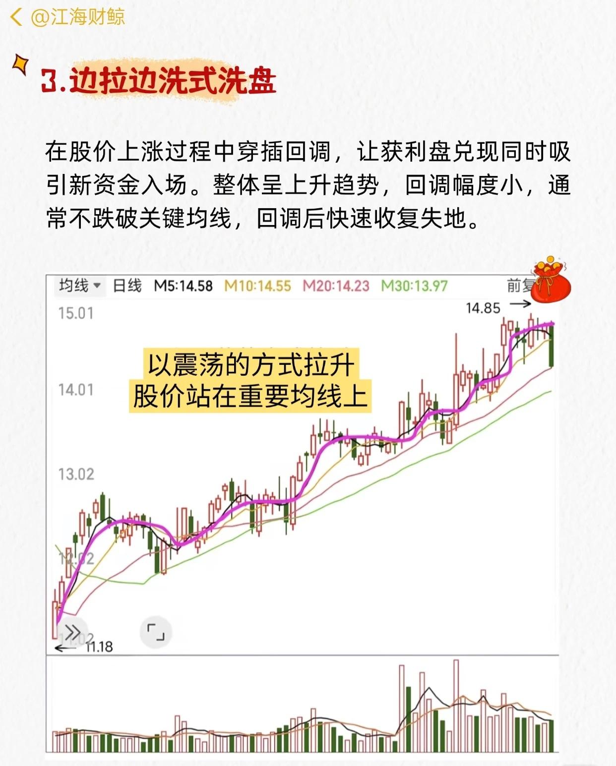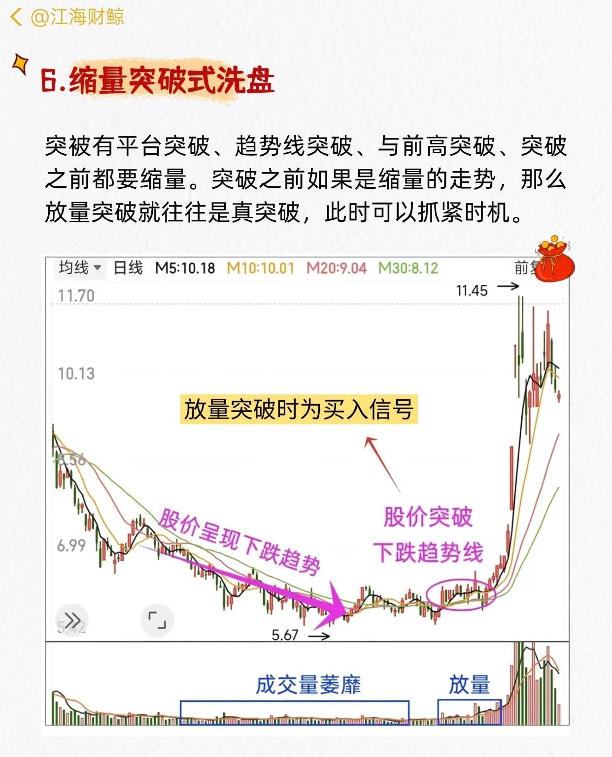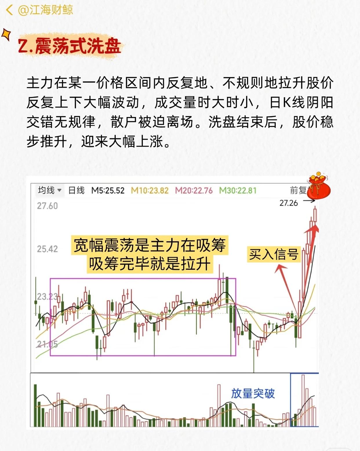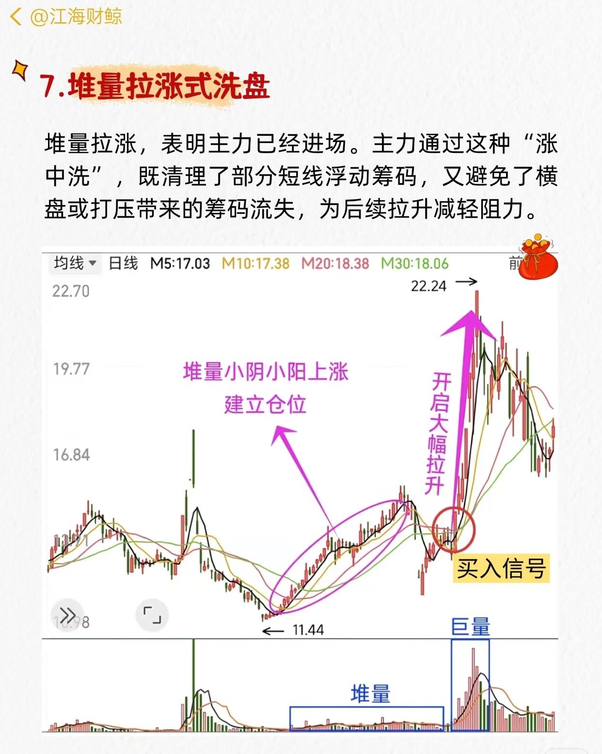 “主力洗盘结束的7大特征”的系列讲解,每张图都结合K线+成交量,说明一种洗盘形态及买入信号,核心如下: 1. 平台式洗盘:底部长期缩量横盘 → 大阳线放量突破 → 买入信号。 2. 震荡式洗盘:区间内宽幅上下波动、量价无规律 → 吸筹完毕后稳步拉升。 3. 边拉边洗式洗盘:上涨中穿插小回调,不破关键均线 → 趋势保持上升。 4. W底洗盘:双底形态,右底略低 → 放量突破颈线为买点。 5. V底洗盘:急跌后快速反转,多根大阳线 → 底部反转时量骤增。 6. 缩量突破式洗盘:突破前缩量,突破时放量 → 真突破,可买入。 7. 堆量拉涨式洗盘:堆量小阴小阳建仓 → 巨量拉升,涨中洗浮筹。 共同要点:洗盘末期多伴随缩量整理→放量突破,配合形态确认,可作为买入参考。