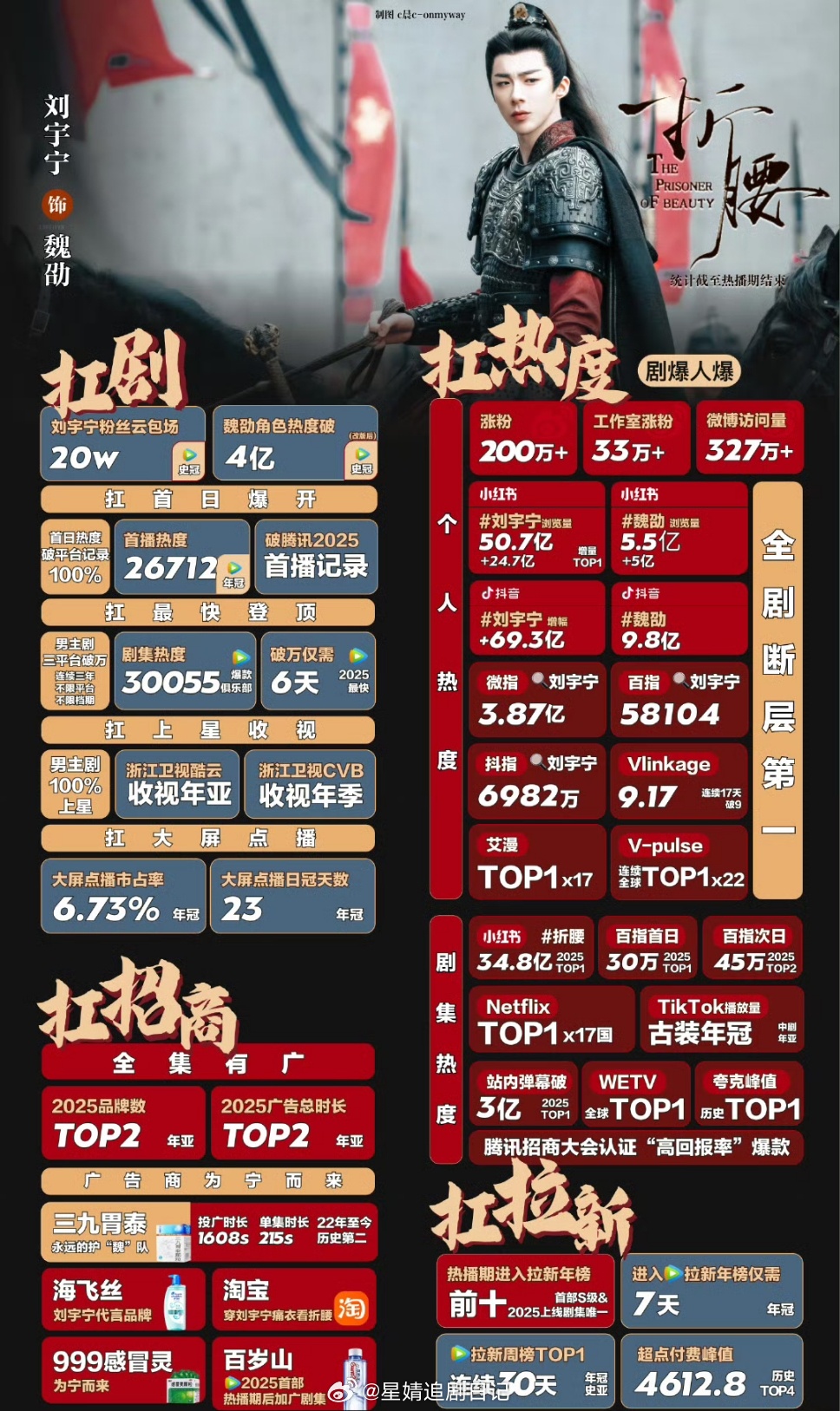 宋祖儿、刘宇宁主演的《折腰》排名2025年腾讯视频古装剧大屏点播top1 不愧是大爆剧 特别是魏劭的含金量持续上升!太牛了!