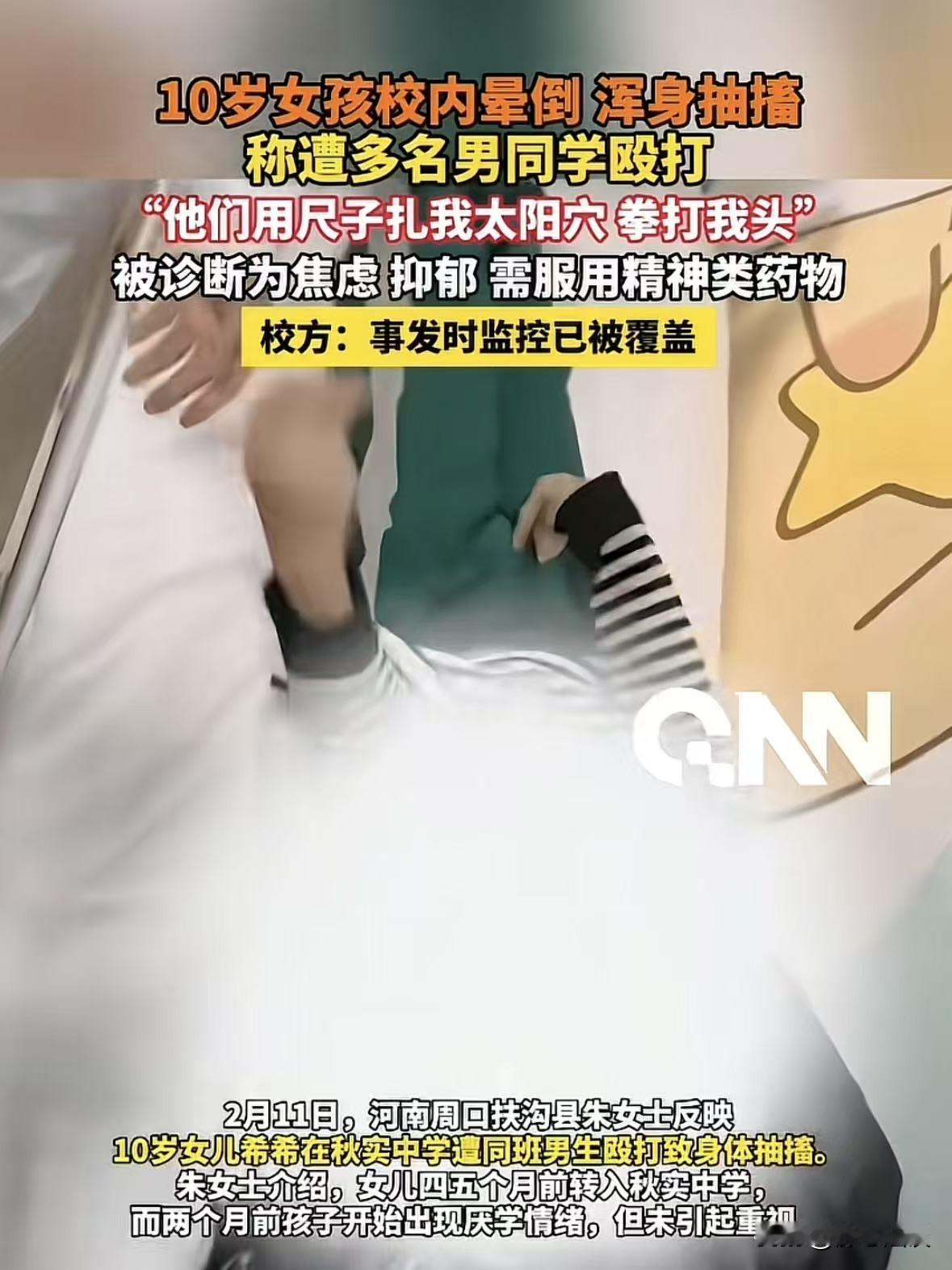 河南周口,10岁女孩在学校突然晕倒,浑身抽搐,被送到医院,其妈妈得知消息急忙赶到医院,随后妈妈在女儿额头上发现伤口,女孩醒后情绪崩溃,说有四五个男生打她,锤她脑袋,还用尺子扎她太阳穴,事后,女孩妈妈要求查看学校监控,却被学校以没有权利为由拒绝,后来又说监控已经被覆盖,现在女孩被诊断为焦虑、抑郁、可能需要长期服用药物。 朱女士的女儿今年才10岁,孩子在四五个月前才转学到这所新学校。 本来换了新环境,家长还挺放心,可大概两个月前,女儿就开始说不想上学。 朱女士当时没往坏处想,只当孩子是不适应新学校、闹小脾气,没太往心里去。 可她万万没想到,孩子藏在心里的,是根本不敢说的恐惧和伤害。 2026年1月23日,朱女士接到学校老师打来的,电话里语气特别急。 告诉她自己的女儿在学校突然晕倒,浑身抽搐,他们已经打120送医院了,要她赶紧过去。 朱女士当时腿都软了,疯了一样往医院跑,到医院一看,女儿躺在病床上,脸色惨白,额头上明晃晃有一道伤口,看着就疼。 朱女士看着女儿,心都碎了,她怎么也想不通,早上还好好送去上学的孩子,怎么就突然变成这样。 过了不知道多久,女儿醒过来,看到妈妈情绪一下子就崩了,哭得撕心裂肺。 朱女士一边安慰女儿,一边问怎么了,女儿哭得抽搐着说:有四五个男同学打我,用拳头使劲锤我脑袋,还用尺子扎我的太阳穴……。 朱女士一听直接就炸了,好好的孩子在学校受这么大罪,当妈的谁能忍? 她第一时间找到学校,要求调监控、找证据、讨说法。 她就想看看,光天化日之下,在学校里,自己的女儿到底是怎么被欺负的。 谁知道学校的操作,简直让人火大,朱女士一边边找学校,就想看看事发当天的监控录像,把事情查清楚。 可学校要么推脱,要么直接拒绝,甚至以朱女士没有权限查看监控为由给拒绝。 不给看就罢了,朱女士没放弃,一直跟学校交涉,拖了一天又一天。 等到终于熬不过去了,学校给出的答案,更是让人绝望,他们表示监控录像已经被覆盖了,查不到当天的视频。 关键证据说没就没,这话说出来谁信? 孩子在学校被打晕倒,这么大的事,学校不第一时间保存监控,反而等到家长要查了,说监控覆盖了? 而比身体受伤更可怕的,是孩子心理上的创伤。 经过医院专业检查诊断,朱女士10岁的女儿被确诊为焦虑症、抑郁症,精神受到了极其严重的刺激。 医生说,后续可能需要长期服用药物,还要做长期的心理疏导。 朱女士一气之下,将此事发到网上,瞬间引发全网愤怒。 大家都在问:学校是保护孩子的地方,怎么成了 霸 凌的温床? 孩子被打,老师没发现吗?监控说覆盖就覆盖,是不是在包庇? 事后记者也多次联系涉事学校,对方一直不回应,全程沉默。 《未成年人保护法》第129条:侵犯未成年人合法权益,造成人身、财产或者其他损害的,依法承担民事责任。 《民法典》第1200条:限制民事行为能力人在学校或者其他教育机构学习、生活期间受到人身损害,学校或者其他教育机构未尽到教育、管理职责的,应当承担侵权责任。 好在正义不会缺席2月12日,相关单位发生:相关领导已经介入处理,成立专项工作组,截至目前事件的具体细节正在进一步调查中。 有人说,大人的几个学生一定要严惩,不然不知道还有多少个受害的学生会遭到毒手。 都希望这次调查能给孩子和家长一个公道,给所有家长一个安心。 毕竟学校的围墙,是用来保护孩子的,不是用来藏污纳垢。 老师的职责,是教书育人,不是对 霸 凌视而不见。 这事也提醒所有有孩子的家长:孩子突然厌学、害怕上学、身上有不明伤口、情绪异常,一定要多问一句、多留心,别让孩子独自承受不敢说的痛苦。 @静心法谈 学法辨是非,慬法不吃亏。