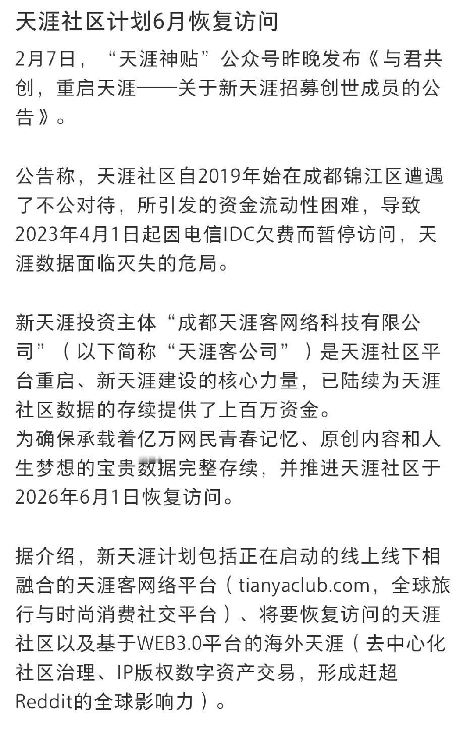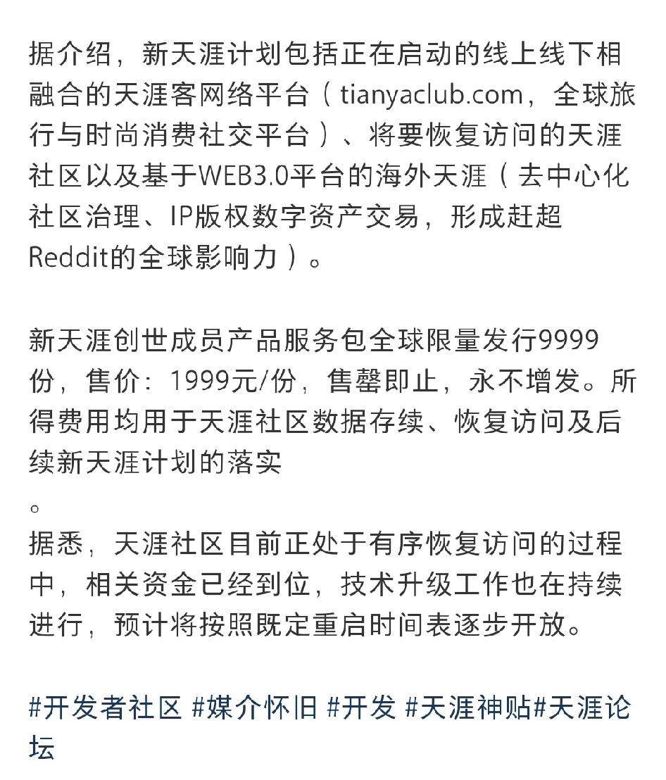 天涯社区,计划6月1日恢复访问。 应该说,天涯社区是许多70后80后,甚至90后的美好回忆,也是PC网络时代的大咖。 当时的天涯有多火?很多社会热点事件就是从天涯爆出来的,记得那时候天天逛天涯。 什么娱乐八卦、国观、球迷一家、天涯杂谈等等。 后来慢慢的,天涯没有贴吧火了,再后来,整个论坛都不行了。