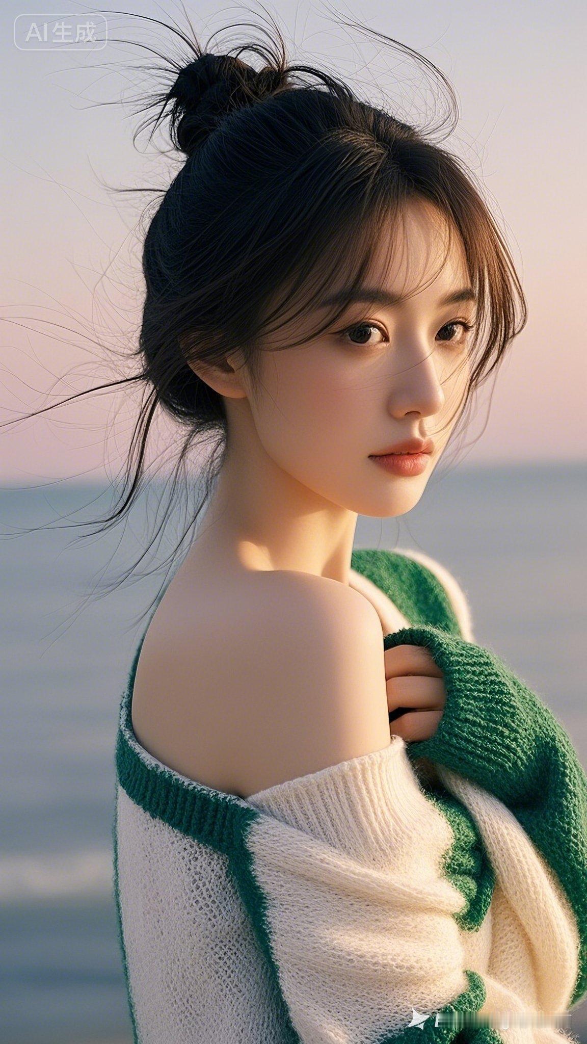 海边少女,温柔海风,绿白相间毛衣,自然妆容,清新自然。