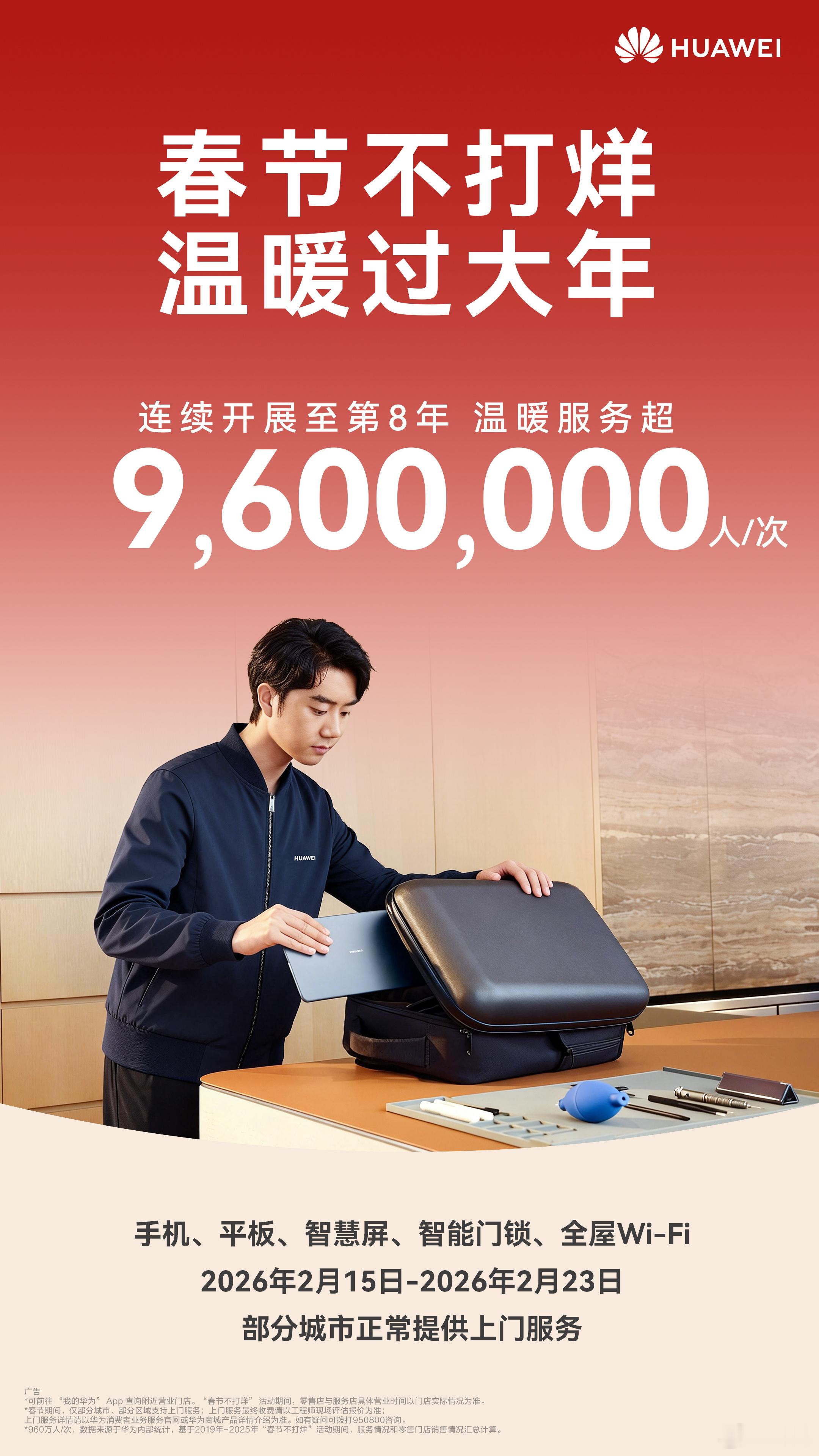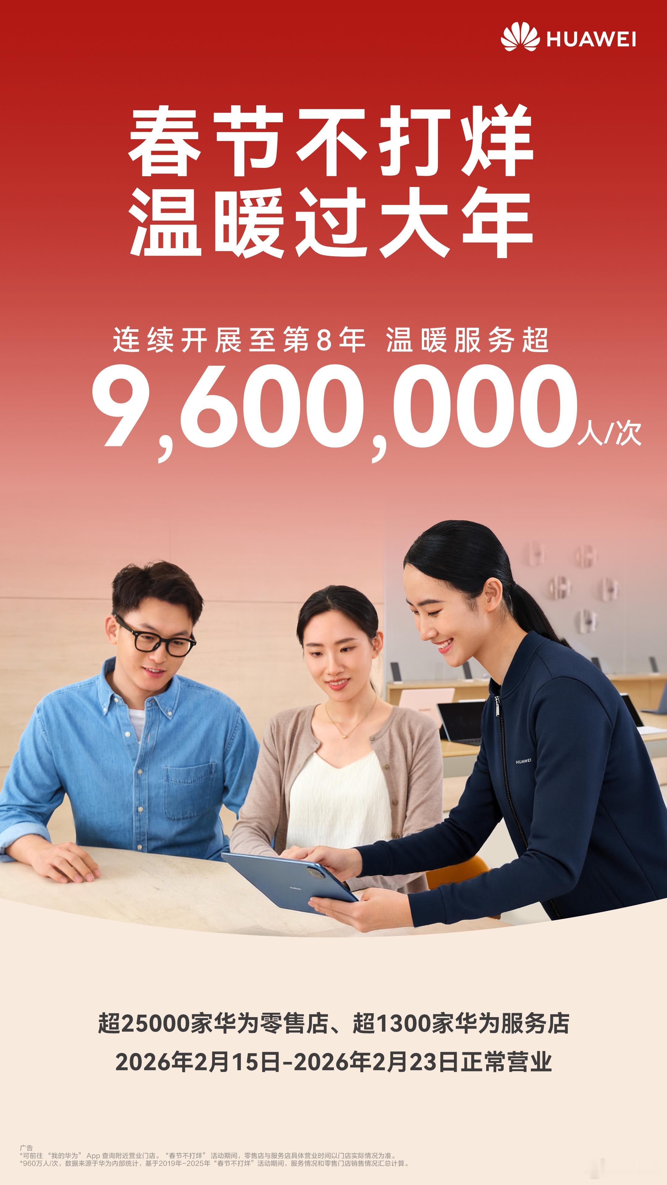 华为春节不打烊已连续开展至第8年,温暖服务超960万人/次。