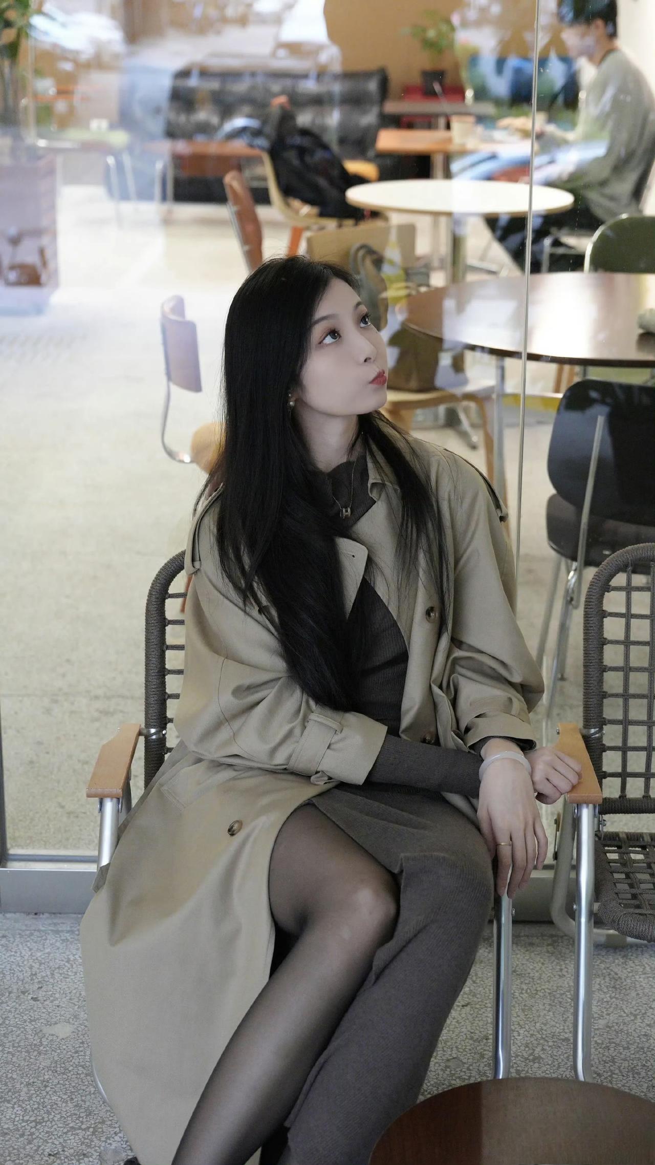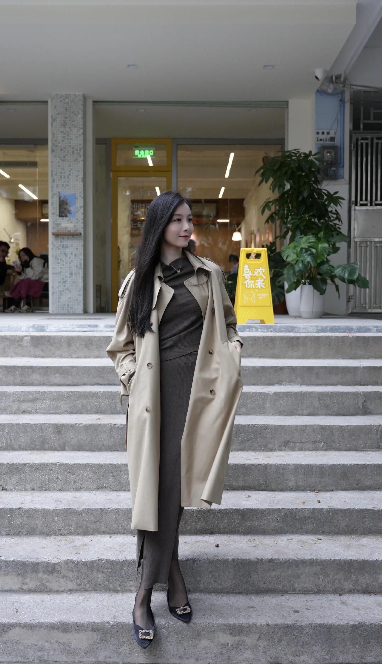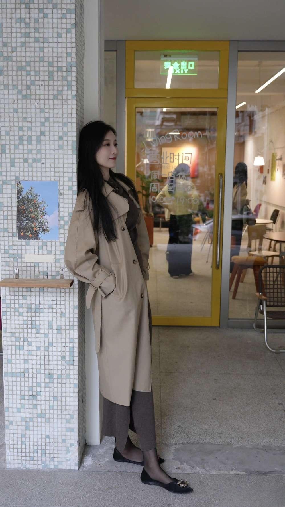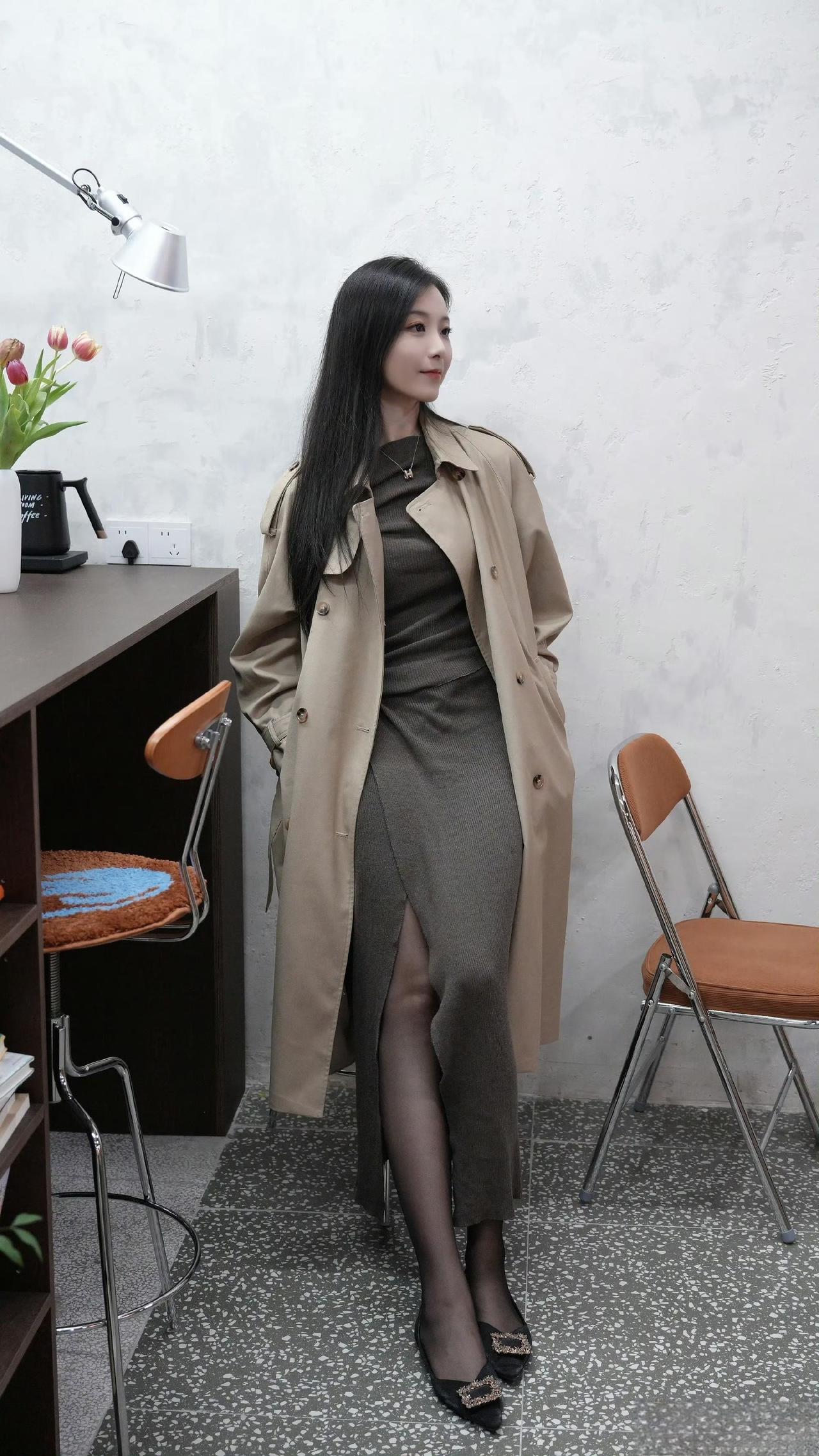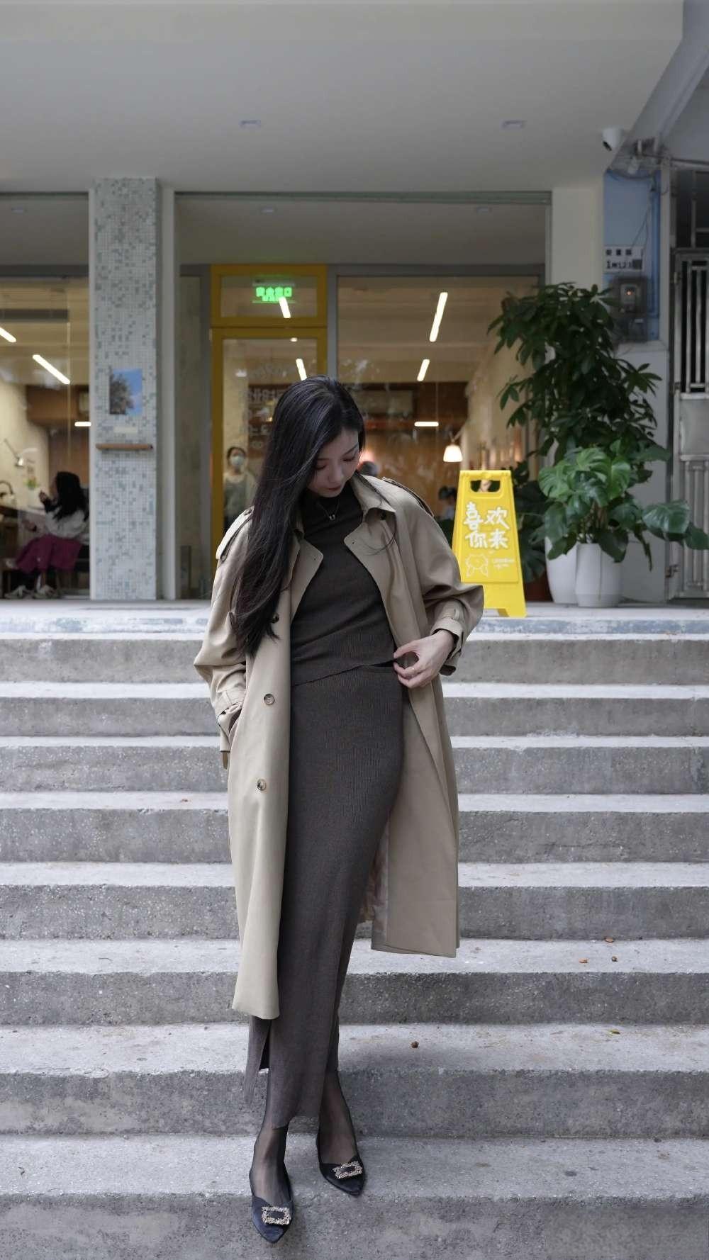 这套穿搭是秋日通勤的质感范本!卡其风衣+深棕针织裙的同色系叠穿高级又温柔,开叉裙添了精致感,带钻鞋子刚好是点睛的细节,整体松弛又有气质~卡其浅咖色穿搭 卡其风衣穿搭