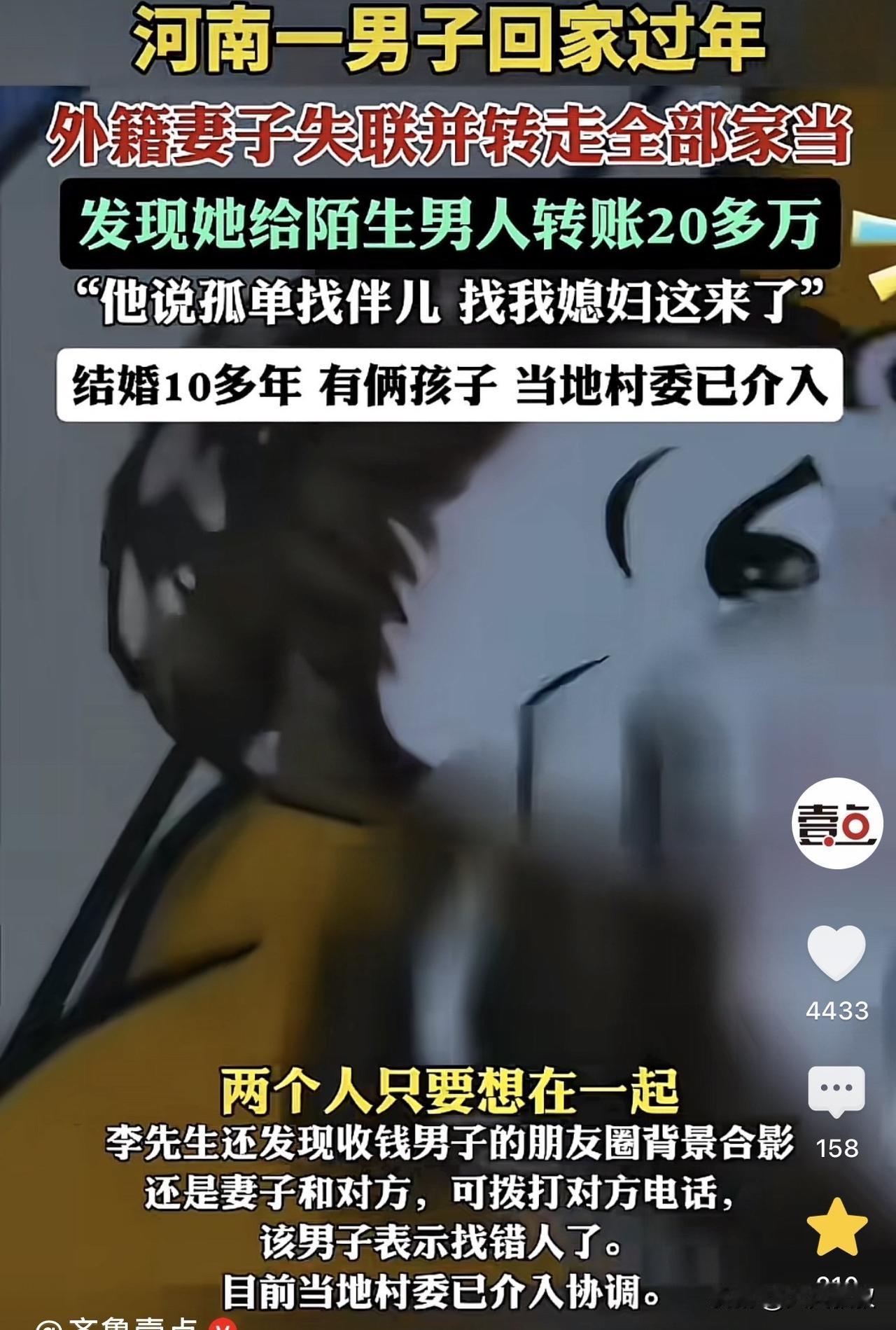 河南济源,一男子十多年前找了外籍媳妇,婚后妻子给男子生了俩孩子,一家四口过得其乐融融,男子一人常年外出打工,赚得钱一分不少的拿给妻子,妻子则在家带俩娃,结果前不久男子回家过年,发现家都被妻子搬空了,20多万的存款不仅没有了,而且妻子也失联了。 据悉,李先生在十多年前找的外籍媳妇结的婚,在十多年前不像今天,当时娶外籍媳妇在当地还是很热闹的,不过结婚之后,媳妇给李先生先后生了俩孩子,一家四口也是过得其乐融融。 因为媳妇语言和身份等问题,所以,李先生就承担起了家庭的开销,一个人去外地打工赚钱,赚的钱也是一分不少的拿给媳妇,而媳妇则一个人在家养着俩孩子,这样的生活,虽然有些枯燥,不过过得还是不错的。 在24年的时候,媳妇也外出打工了,可是打工回来之后,媳妇就对李先生开始有些疏远,虽然看着妻子对自己日渐冷淡,但是李先生还是抱有热情,不仅给妻子买花,还在生日时给对方包红包。 然而,换来的却是妻子整夜整夜的不回家,前不久,妻子回家时,李先生就登上了妻子的微信,结果却看到一个男子的头像背景是和自己妻子拍的合影,而且对方转给妻子5200元,妻子也回给对方520元。 李先生经过计算发现,这个男的先后给自己媳妇转了3万多,而自己媳妇却给对方转了20多万,而这笔钱,却是李先生家里全部的家当。 后来,李先生打听到,媳妇的闺蜜喜欢这个男的,也给这个男的转了3万多,但是闺蜜的老公住院后要用钱,媳妇闺蜜给这个男的要钱,对方说没有,闺蜜的老公就心梗去死了,估计这个钱也要不回来了吧。 而现在,李先生的状况是妻子却突然失联,根本找不到了。当地村委表示,已经介入帮着处理这件事情。 事发后,有网友说,越南的吧?我们这边也有一个,当时花了12万多找的,孩子不到一岁说回娘家看看老人,结果一去不回,虽然能联系上,但是张口就要10万才回来。 还有网友说,这个男的心有多大,外籍媳妇,不是外地媳妇,还让人家管着家里的钱,只能说太相信外国人了。 也有网友说,人家来10多年了,十多年的夫妻了,就是因为是外籍所以才有这么大话题,如果是外地的,估计根本没有讨论余地。 其实,无论是外籍还是外地,只要是登记结婚的,才算是夫妻关系,如果没有登记,只是举办了婚礼,那么只能算是同居关系。 本起事件中,李先生和妻子有俩孩子,正常来说登记结婚的可能性还是很大的,毕竟,孩子要长大要上学,如果不登记结婚,对于孩子来说也有一定的影响。 现在妻子并不是拿着钱跑了,而是转给了这个男的,那么,李先生想要要回这笔钱显然有很大的可能性。 毕竟,因为这笔钱是夫妻共同财产,妻子单独将这些钱赠与给了第三方,这就侵犯了丈夫对共同财产的支配权,所以丈夫有权确认赠与无效,而且从公序良俗的角度出发,这种赠与也是无效的。 现在只要李先生能够确定对方的身份,便可以向法院提起诉讼,要求对方返还这笔钱。 当然,对于李先生的妻子而言,因为其行为属于挥霍、转移、侵害夫妻共同财产的行为,如果李先生真的不打算和妻子过了,据此是可以要求多分财产的。 其实,这种事情和外地外籍关系不大,在网上看到让自己心动的异性,以此转账获得对方青睐,不仅仅是李先生的妻子,还有很多类似的人。 对此,你对本案有什么看法? —————————— 关注我,带你评析法律热点,关注冷暖人生。 文章原创,抄袭必究