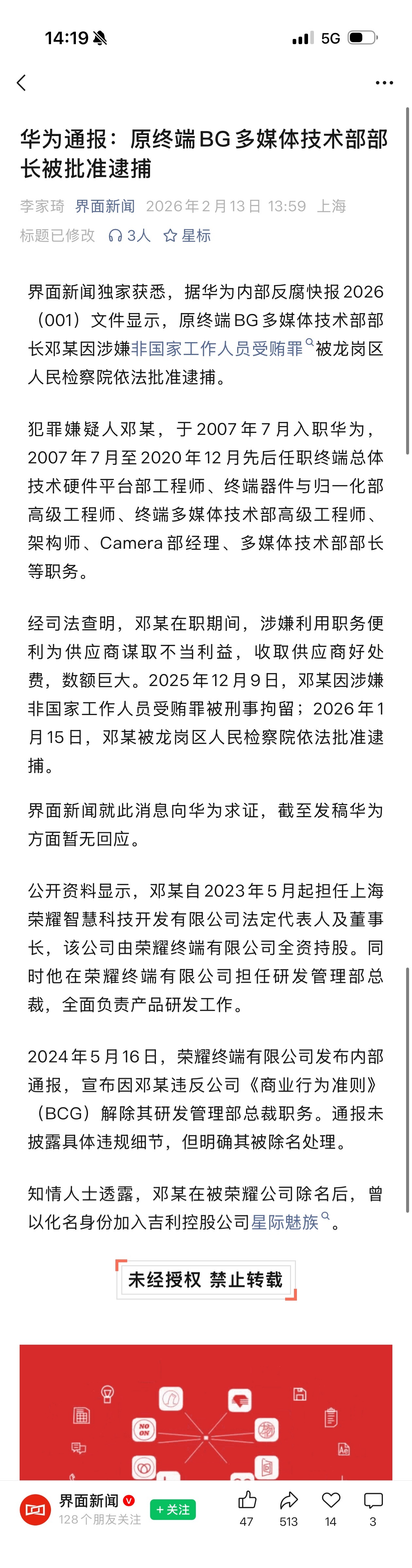 界面新闻:华为通报原终端BG多媒体技术部部长被批准逮捕。